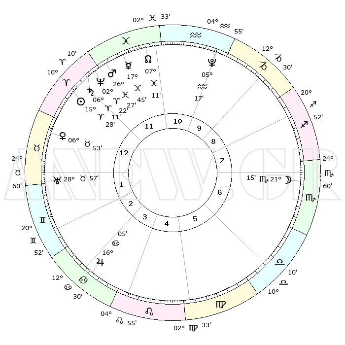 | | ΘΕΣΕΙΣ ΠΛΑΝΗΤΩΝ ΑΣΤΡΟΛΟΓΙΚΟΥ ΧΑΡΤΗ ΤΗΣ ΣΤΙΓΜΗΣ ΑΥΤΗΣ | | | | Πλανήτης | Ζώδιο | Μοίρες | Δεκαήμ. | Σε οίκο | Απόκλιση | | Ακμές των οίκων | | Ηλιος | Κριός | 15°14' | Δεύτερο | 3 | 06 N 00 | | 1ος | 16°06' | Αιγόκερως | | Σελήνη | Σκορπιός | 18°12' | Δεύτερο | 10 | 21 S 54 | | 2ος | 27°20' | Υδροχόος | | Ερμής | Ιχθείς | 17°29' | Δεύτερο | 2 | 06 S 39 | | 3ος | 07°22' | Κριός | | Αφροδίτη | Ταύρος | 06°34' | Πρώτο | 3 | 13 N 27 | | 4ος | 08°24' | Ταύρος | | Αρης | Ιχθείς | 26°15' | Τρίτο | 2 | 02 S 26 | | 5ος | 02°28' | Δίδυμοι | | Δίας | Καρκίνος | 16°04' | Δεύτερο | 6 | 22 N 50 | | 6ος | 23°41' | Δίδυμοι | | Κρόνος | Κριός | 06°09' | Πρώτο | 2 | 00 N 29 | | 7ος | 16°06' | Καρκίνος | | Ουρανός | Ταύρος | 28°57' | Τρίτο | 4 | 19 N 45 | | 8ος | 27°20' | Λέων | | Ποσειδώνας | Κριός | 02°22' | Πρώτο | 2 | 00 S 16 | | 9ος | 07°22' | Ζυγός | | Πλούτωνας | Υδροχόος | 05°17' | Πρώτο | 1 | 22 S 47 | | 10ος | 08°24' | Σκορπιός | | Β. Δεσμός | Ιχθείς | 07°12' | Πρώτο | 2 | 08 S 52 | | 11ος | 02°28' | Τοξότης | | Ωροσκόπος | Αιγόκερως | 16°06' | Δεύτερο | | | 12ος | 23°41' | Τοξότης | | Μεσουράνημα | Σκορπιός | 08°24' | Πρώτο | | | |