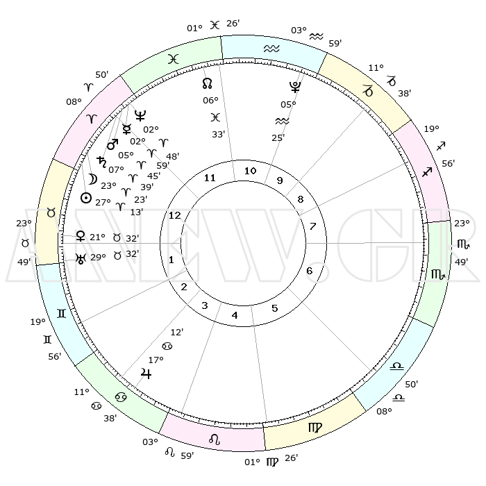 | | ΘΕΣΕΙΣ ΠΛΑΝΗΤΩΝ ΑΣΤΡΟΛΟΓΙΚΟΥ ΧΑΡΤΗ ΤΗΣ ΣΤΙΓΜΗΣ ΑΥΤΗΣ | | | | Πλανήτης | Ζώδιο | Μοίρες | Δεκαήμ. | Σε οίκο | Απόκλιση | | Ακμές των οίκων | | Ηλιος | Κριός | 27°11' | Τρίτο | 12 | 10 N 28 | | 1ος | 03°50' | Ταύρος | | Σελήνη | Κριός | 22°47' | Τρίτο | 12 | 12 N 13 | | 2ος | 04°60' | Δίδυμοι | | Ερμής | Κριός | 02°56' | Πρώτο | 12 | 01 S 15 | | 3ος | 28°11' | Δίδυμοι | | Αφροδίτη | Ταύρος | 21°29' | Τρίτο | 1 | 18 N 23 | | 4ος | 19°53' | Καρκίνος | | Αρης | Κριός | 05°44' | Πρώτο | 12 | 01 N 23 | | 5ος | 14°41' | Λέων | | Δίας | Καρκίνος | 17°12' | Δεύτερο | 3 | 22 N 42 | | 6ος | 18°10' | Παρθένος | | Κρόνος | Κριός | 07°39' | Πρώτο | 12 | 01 N 04 | | 7ος | 03°49' | Σκορπιός | | Ουρανός | Ταύρος | 29°32' | Τρίτο | 1 | 19 N 53 | | 8ος | 04°60' | Τοξότης | | Ποσειδώνας | Κριός | 02°48' | Πρώτο | 12 | 00 S 06 | | 9ος | 28°11' | Τοξότης | | Πλούτωνας | Υδροχόος | 05°25' | Πρώτο | 10 | 22 S 47 | | 10ος | 19°53' | Αιγόκερως | | Β. Δεσμός | Ιχθείς | 06°33' | Πρώτο | 11 | 09 S 06 | | 11ος | 14°41' | Υδροχόος | | Ωροσκόπος | Ταύρος | 03°50' | Πρώτο | | | 12ος | 18°10' | Ιχθείς | | Μεσουράνημα | Αιγόκερως | 19°53' | Δεύτερο | | | |