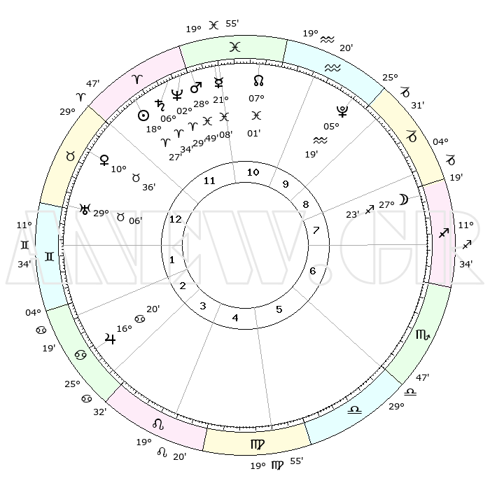 | | ΘΕΣΕΙΣ ΠΛΑΝΗΤΩΝ ΑΣΤΡΟΛΟΓΙΚΟΥ ΧΑΡΤΗ ΤΗΣ ΣΤΙΓΜΗΣ ΑΥΤΗΣ | | | | Πλανήτης | Ζώδιο | Μοίρες | Δεκαήμ. | Σε οίκο | Απόκλιση | | Ακμές των οίκων | | Ηλιος | Κριός | 18°23' | Δεύτερο | 12 | 07 N 12 | | 1ος | 11°51' | Ταύρος | | Σελήνη | Τοξότης | 26°35' | Τρίτο | 8 | 28 S 17 | | 2ος | 10°53' | Δίδυμοι | | Ερμής | Ιχθείς | 21°03' | Τρίτο | 11 | 05 S 34 | | 3ος | 03°22' | Καρκίνος | | Αφροδίτη | Ταύρος | 10°31' | Δεύτερο | 12 | 14 N 51 | | 4ος | 25°14' | Καρκίνος | | Αρης | Ιχθείς | 28°46' | Τρίτο | 12 | 01 S 26 | | 5ος | 20°58' | Λέων | | Δίας | Καρκίνος | 16°20' | Δεύτερο | 3 | 22 N 48 | | 6ος | 26°04' | Παρθένος | | Κρόνος | Κριός | 06°33' | Πρώτο | 12 | 00 N 38 | | 7ος | 11°51' | Σκορπιός | | Ουρανός | Ταύρος | 29°06' | Τρίτο | 1 | 19 N 47 | | 8ος | 10°53' | Τοξότης | | Ποσειδώνας | Κριός | 02°29' | Πρώτο | 12 | 00 S 13 | | 9ος | 03°22' | Αιγόκερως | | Πλούτωνας | Υδροχόος | 05°19' | Πρώτο | 10 | 22 S 47 | | 10ος | 25°14' | Αιγόκερως | | Β. Δεσμός | Ιχθείς | 07°01' | Πρώτο | 11 | 08 S 56 | | 11ος | 20°58' | Υδροχόος | | Ωροσκόπος | Ταύρος | 11°51' | Δεύτερο | | | 12ος | 26°04' | Ιχθείς | | Μεσουράνημα | Αιγόκερως | 25°14' | Τρίτο | | | |