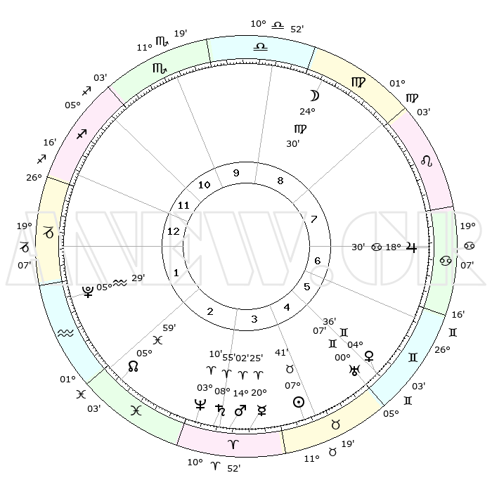 | | ΘΕΣΕΙΣ ΠΛΑΝΗΤΩΝ ΑΣΤΡΟΛΟΓΙΚΟΥ ΧΑΡΤΗ ΤΗΣ ΣΤΙΓΜΗΣ ΑΥΤΗΣ | | | | Πλανήτης | Ζώδιο | Μοίρες | Δεκαήμ. | Σε οίκο | Απόκλιση | | Ακμές των οίκων | | Ηλιος | Ταύρος | 07°37' | Πρώτο | 4 | 14 N 03 | | 1ος | 28°16' | Τοξότης | | Σελήνη | Παρθένος | 23°45' | Τρίτο | 9 | 01 N 09 | | 2ος | 04°58' | Υδροχόος | | Ερμής | Κριός | 20°19' | Τρίτο | 4 | 05 N 52 | | 3ος | 14°50' | Ιχθείς | | Αφροδίτη | Δίδυμοι | 04°31' | Πρώτο | 5 | 21 N 47 | | 4ος | 19°03' | Κριός | | Αρης | Κριός | 13°60' | Δεύτερο | 3 | 04 N 41 | | 5ος | 15°39' | Ταύρος | | Δίας | Καρκίνος | 18°30' | Δεύτερο | 7 | 22 N 32 | | 6ος | 07°34' | Δίδυμοι | | Κρόνος | Κριός | 08°54' | Πρώτο | 3 | 01 N 32 | | 7ος | 28°16' | Δίδυμοι | | Ουρανός | Δίδυμοι | 00°06' | Πρώτο | 5 | 20 N 00 | | 8ος | 04°58' | Λέων | | Ποσειδώνας | Κριός | 03°10' | Πρώτο | 3 | 00 N 03 | | 9ος | 14°50' | Παρθένος | | Πλούτωνας | Υδροχόος | 05°29' | Πρώτο | 2 | 22 S 48 | | 10ος | 19°03' | Ζυγός | | Β. Δεσμός | Ιχθείς | 05°59' | Πρώτο | 2 | 09 S 19 | | 11ος | 15°39' | Σκορπιός | | Ωροσκόπος | Τοξότης | 28°16' | Τρίτο | | | 12ος | 07°34' | Τοξότης | | Μεσουράνημα | Ζυγός | 19°03' | Δεύτερο | | | |