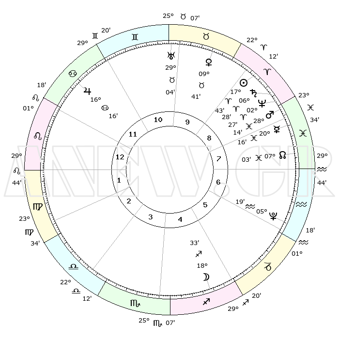 | | ΘΕΣΕΙΣ ΠΛΑΝΗΤΩΝ ΑΣΤΡΟΛΟΓΙΚΟΥ ΧΑΡΤΗ ΤΗΣ ΣΤΙΓΜΗΣ ΑΥΤΗΣ | | | | Πλανήτης | Ζώδιο | Μοίρες | Δεκαήμ. | Σε οίκο | Απόκλιση | | Ακμές των οίκων | | Ηλιος | Κριός | 17°39' | Δεύτερο | 9 | 06 N 56 | | 1ος | 10°13' | Λέων | | Σελήνη | Τοξότης | 17°45' | Δεύτερο | 5 | 27 S 56 | | 2ος | 02°04' | Παρθένος | | Ερμής | Ιχθείς | 20°11' | Τρίτο | 8 | 05 S 50 | | 3ος | 28°29' | Παρθένος | | Αφροδίτη | Ταύρος | 09°36' | Πρώτο | 10 | 14 N 32 | | 4ος | 00°34' | Σκορπιός | | Αρης | Ιχθείς | 28°11' | Τρίτο | 8 | 01 S 39 | | 5ος | 06°10' | Τοξότης | | Δίας | Καρκίνος | 16°16' | Δεύτερο | 12 | 22 N 49 | | 6ος | 10°17' | Αιγόκερως | | Κρόνος | Κριός | 06°28' | Πρώτο | 9 | 00 N 36 | | 7ος | 10°13' | Υδροχόος | | Ουρανός | Ταύρος | 29°03' | Τρίτο | 10 | 19 N 47 | | 8ος | 02°04' | Ιχθείς | | Ποσειδώνας | Κριός | 02°27' | Πρώτο | 9 | 00 S 14 | | 9ος | 28°29' | Ιχθείς | | Πλούτωνας | Υδροχόος | 05°19' | Πρώτο | 6 | 22 S 47 | | 10ος | 00°34' | Ταύρος | | Β. Δεσμός | Ιχθείς | 07°04' | Πρώτο | 8 | 08 S 55 | | 11ος | 06°10' | Δίδυμοι | | Ωροσκόπος | Λέων | 10°13' | Δεύτερο | | | 12ος | 10°17' | Καρκίνος | | Μεσουράνημα | Ταύρος | 00°34' | Πρώτο | | | |