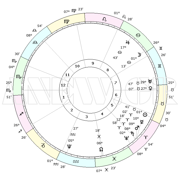 | | ΘΕΣΕΙΣ ΠΛΑΝΗΤΩΝ ΑΣΤΡΟΛΟΓΙΚΟΥ ΧΑΡΤΗ ΤΗΣ ΣΤΙΓΜΗΣ ΑΥΤΗΣ | | | | Πλανήτης | Ζώδιο | Μοίρες | Δεκαήμ. | Σε οίκο | Απόκλιση | | Ακμές των οίκων | | Ηλιος | Ταύρος | 01°37' | Πρώτο | 6 | 12 N 02 | | 1ος | 04°31' | Σκορπιός | | Σελήνη | Καρκίνος | 00°09' | Πρώτο | 8 | 28 N 08 | | 2ος | 03°12' | Τοξότης | | Ερμής | Κριός | 09°55' | Πρώτο | 5 | 01 N 33 | | 3ος | 05°33' | Αιγόκερως | | Αφροδίτη | Ταύρος | 27°02' | Τρίτο | 7 | 19 N 57 | | 4ος | 10°03' | Υδροχόος | | Αρης | Κριός | 09°15' | Πρώτο | 5 | 02 N 48 | | 5ος | 12°54' | Ιχθείς | | Δίας | Καρκίνος | 17°43' | Δεύτερο | 9 | 22 N 38 | | 6ος | 11°08' | Κριός | | Κρόνος | Κριός | 08°11' | Πρώτο | 5 | 01 N 16 | | 7ος | 04°31' | Ταύρος | | Ουρανός | Ταύρος | 29°46' | Τρίτο | 7 | 19 N 56 | | 8ος | 03°12' | Δίδυμοι | | Ποσειδώνας | Κριός | 02°57' | Πρώτο | 5 | 00 S 02 | | 9ος | 05°33' | Καρκίνος | | Πλούτωνας | Υδροχόος | 05°27' | Πρώτο | 3 | 22 S 48 | | 10ος | 10°03' | Λέων | | Β. Δεσμός | Ιχθείς | 06°18' | Πρώτο | 4 | 09 S 12 | | 11ος | 12°54' | Παρθένος | | Ωροσκόπος | Σκορπιός | 04°31' | Πρώτο | | | 12ος | 11°08' | Ζυγός | | Μεσουράνημα | Λέων | 10°03' | Δεύτερο | | | |
