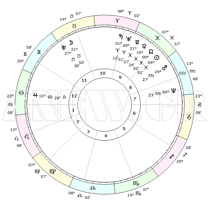 | | ΘΕΣΕΙΣ ΠΛΑΝΗΤΩΝ ΑΣΤΡΟΛΟΓΙΚΟΥ ΧΑΡΤΗ ΤΗΣ ΣΤΙΓΜΗΣ ΑΥΤΗΣ | | | | Πλανήτης | Ζώδιο | Μοίρες | Δεκαήμ. | Σε οίκο | Απόκλιση | | Ακμές των οίκων | | Ηλιος | Ιχθείς | 04°50' | Πρώτο | 9 | 09 S 44 | | 1ος | 01°11' | Καρκίνος | | Σελήνη | Ταύρος | 20°50' | Τρίτο | 11 | 22 N 48 | | 2ος | 21°55' | Καρκίνος | | Ερμής | Ιχθείς | 21°55' | Τρίτο | 10 | 01 S 15 | | 3ος | 13°48' | Λέων | | Αφροδίτη | Ιχθείς | 16°19' | Δεύτερο | 10 | 06 S 43 | | 4ος | 10°18' | Παρθένος | | Αρης | Υδροχόος | 24°23' | Τρίτο | 9 | 14 S 25 | | 5ος | 14°25' | Ζυγός | | Δίας | Καρκίνος | 15°29'R | Δεύτερο | 1 | 22 N 52 | | 6ος | 24°20' | Σκορπιός | | Κρόνος | Κριός | 01°11' | Πρώτο | 10 | 01 S 29 | | 7ος | 01°11' | Αιγόκερως | | Ουρανός | Ταύρος | 27°38' | Τρίτο | 12 | 19 N 27 | | 8ος | 21°55' | Αιγόκερως | | Ποσειδώνας | Κριός | 00°51' | Πρώτο | 10 | 00 S 52 | | 9ος | 13°48' | Υδροχόος | | Πλούτωνας | Υδροχόος | 04°23' | Πρώτο | 8 | 22 S 54 | | 10ος | 10°18' | Ιχθείς | | Β. Δεσμός | Ιχθείς | 09°20' | Πρώτο | 9 | 08 S 04 | | 11ος | 14°25' | Κριός | | Ωροσκόπος | Καρκίνος | 01°11' | Πρώτο | | | 12ος | 24°20' | Ταύρος | | Μεσουράνημα | Ιχθείς | 10°18' | Δεύτερο | | | |