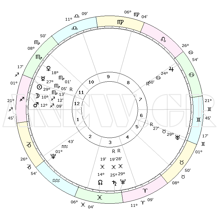 | | ΘΕΣΕΙΣ ΠΛΑΝΗΤΩΝ ΑΣΤΡΟΛΟΓΙΚΟΥ ΧΑΡΤΗ ΤΗΣ ΣΤΙΓΜΗΣ ΑΥΤΗΣ | | | | Πλανήτης | Ζώδιο | Μοίρες | Δεκαήμ. | Σε οίκο | Απόκλιση | | Ακμές των οίκων | | Ηλιος | Σκορπιός | 29°11' | Τρίτο | 12 | 19 S 58 | | 1ος | 09°37' | Τοξότης | | Σελήνη | Τοξότης | 09°44' | Πρώτο | 1 | 26 S 50 | | 2ος | 12°16' | Αιγόκερως | | Ερμής | Σκορπιός | 27°08'R | Τρίτο | 12 | 18 S 42 | | 3ος | 19°36' | Υδροχόος | | Αφροδίτη | Σκορπιός | 17°58' | Δεύτερο | 11 | 16 S 11 | | 4ος | 25°36' | Ιχθείς | | Αρης | Τοξότης | 12°07' | Δεύτερο | 1 | 22 S 49 | | 5ος | 25°16' | Κριός | | Δίας | Καρκίνος | 24°60'R | Τρίτο | 8 | 21 N 15 | | 6ος | 19°04' | Ταύρος | | Κρόνος | Ιχθείς | 25°19'R | Τρίτο | 3 | 04 S 04 | | 7ος | 09°37' | Δίδυμοι | | Ουρανός | Ταύρος | 29°27'R | Τρίτο | 6 | 19 N 50 | | 8ος | 12°16' | Καρκίνος | | Ποσειδώνας | Ιχθείς | 29°29'R | Τρίτο | 4 | 01 S 27 | | 9ος | 19°36' | Λέων | | Πλούτωνας | Υδροχόος | 01°43' | Πρώτο | 2 | 23 S 27 | | 10ος | 25°36' | Παρθένος | | Β. Δεσμός | Ιχθείς | 14°20' | Δεύτερο | 3 | 06 S 10 | | 11ος | 25°16' | Ζυγός | | Ωροσκόπος | Τοξότης | 09°37' | Πρώτο | | | 12ος | 19°04' | Σκορπιός | | Μεσουράνημα | Παρθένος | 25°36' | Τρίτο | | | |
