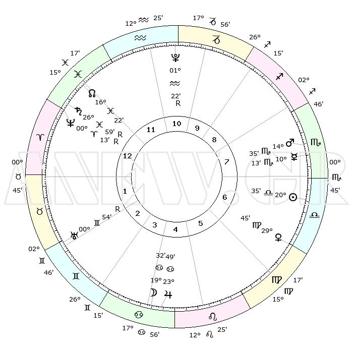 | ΘΕΣΕΙΣ ΠΛΑΝΗΤΩΝ ΑΣΤΡΟΛΟΓΙΚΟΥ ΧΑΡΤΗ ΤΗΣ ΣΤΙΓΜΗΣ ΑΥΤΗΣ | | Πλανήτης | Ζώδιο | Μοίρες | Δεκαήμ. | Σε οίκο | Απόκλιση | | Ακμές των οίκων | Ηλιος | Ζυγός | 20°29' | Τρίτο | 7 | 08 S 00 | | 1ος | 06°06' | Ιχθείς | Σελήνη | Καρκίνος | 18°14' | Δεύτερο | 5 | 26 N 39 | | 2ος | 20°54' | Κριός | Ερμής | Σκορπιός | 10°05' | Δεύτερο | 8 | 16 S 20 | | 3ος | 22°26' | Ταύρος | Αφροδίτη | Παρθένος | 29°38' | Τρίτο | 7 | 01 N 31 | | 4ος | 16°16' | Δίδυμοι | Αρης | Σκορπιός | 14°31' | Δεύτερο | 8 | 16 S 23 | | 5ος | 07°58' | Καρκίνος | Δίας | Καρκίνος | 23°48' | Τρίτο | 5 | 21 N 23 | | 6ος | 02°11' | Λέων | Κρόνος | Ιχθείς | 26°59'R | Τρίτο | 1 | 03 S 30 | | 7ος | 06°06' | Παρθένος | Ουρανός | Δίδυμοι | 00°54'R | Πρώτο | 3 | 20 N 08 | | 8ος | 20°54' | Ζυγός | Ποσειδώνας | Κριός | 00°13'R | Πρώτο | 1 | 01 S 11 | | 9ος | 22°26' | Σκορπιός | Πλούτωνας | Υδροχόος | 01°22'R | Πρώτο | 11 | 23 S 32 | | 10ος | 16°16' | Τοξότης | Β. Δεσμός | Ιχθείς | 16°23' | Δεύτερο | 1 | 05 S 23 | | 11ος | 07°58' | Αιγόκερως | Ωροσκόπος | Ιχθείς | 06°06' | Πρώτο | | | 12ος | 02°11' | Υδροχόος | Μεσουράνημα | Τοξότης | 16°16' | Δεύτερο | | | |