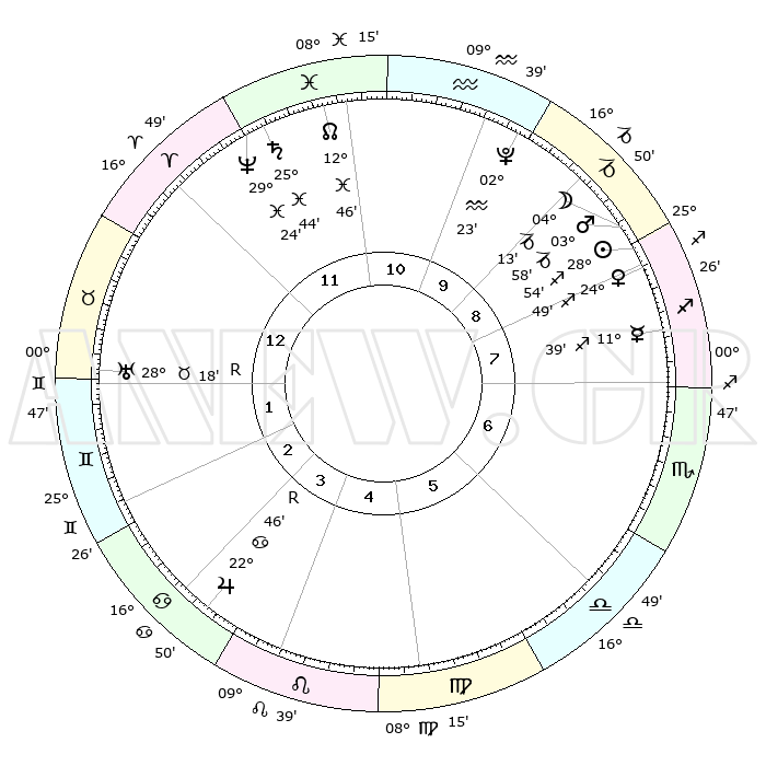 | | ΘΕΣΕΙΣ ΠΛΑΝΗΤΩΝ ΑΣΤΡΟΛΟΓΙΚΟΥ ΧΑΡΤΗ ΤΗΣ ΣΤΙΓΜΗΣ ΑΥΤΗΣ | | | | Πλανήτης | Ζώδιο | Μοίρες | Δεκαήμ. | Σε οίκο | Απόκλιση | | Ακμές των οίκων | | Ηλιος | Τοξότης | 28°50' | Τρίτο | 9 | 23 S 26 | | 1ος | 22°54' | Κριός | | Σελήνη | Αιγόκερως | 03°17' | Πρώτο | 9 | 28 S 03 | | 2ος | 27°06' | Ταύρος | | Ερμής | Τοξότης | 11°32' | Δεύτερο | 8 | 21 S 20 | | 3ος | 21°26' | Δίδυμοι | | Αφροδίτη | Τοξότης | 24°43' | Τρίτο | 9 | 23 S 23 | | 4ος | 13°08' | Καρκίνος | | Αρης | Αιγόκερως | 03°55' | Πρώτο | 9 | 24 S 11 | | 5ος | 06°53' | Λέων | | Δίας | Καρκίνος | 22°46'R | Τρίτο | 4 | 21 N 43 | | 6ος | 08°13' | Παρθένος | | Κρόνος | Ιχθείς | 25°43' | Τρίτο | 12 | 03 S 49 | | 7ος | 22°54' | Ζυγός | | Ουρανός | Ταύρος | 28°18'R | Τρίτο | 2 | 19 N 35 | | 8ος | 27°06' | Σκορπιός | | Ποσειδώνας | Ιχθείς | 29°24' | Τρίτο | 12 | 01 S 28 | | 9ος | 21°26' | Τοξότης | | Πλούτωνας | Υδροχόος | 02°23' | Πρώτο | 10 | 23 S 17 | | 10ος | 13°08' | Αιγόκερως | | Β. Δεσμός | Ιχθείς | 12°47' | Δεύτερο | 12 | 06 S 46 | | 11ος | 06°53' | Υδροχόος | | Ωροσκόπος | Κριός | 22°54' | Τρίτο | | | 12ος | 08°13' | Ιχθείς | | Μεσουράνημα | Αιγόκερως | 13°08' | Δεύτερο | | | |