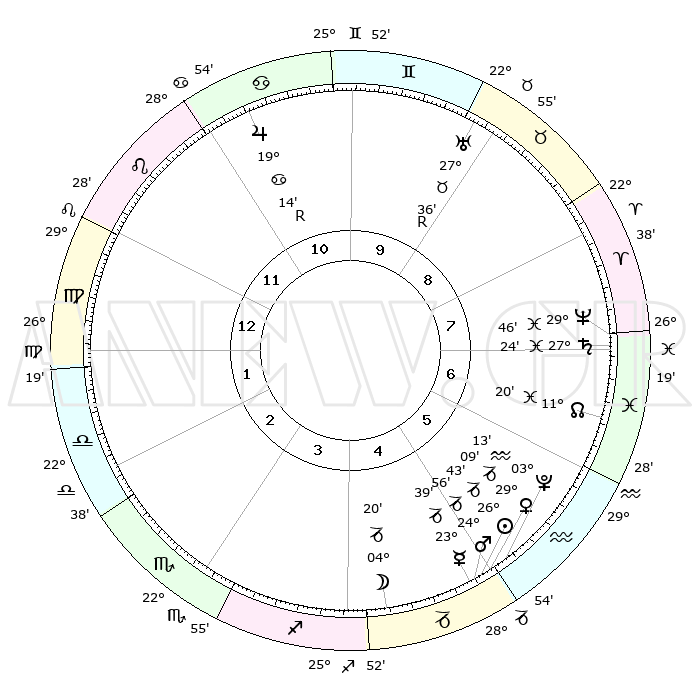 | | ΘΕΣΕΙΣ ΠΛΑΝΗΤΩΝ ΑΣΤΡΟΛΟΓΙΚΟΥ ΧΑΡΤΗ ΤΗΣ ΣΤΙΓΜΗΣ ΑΥΤΗΣ | | | | Πλανήτης | Ζώδιο | Μοίρες | Δεκαήμ. | Σε οίκο | Απόκλιση | | Ακμές των οίκων | | Ηλιος | Αιγόκερως | 26°39' | Τρίτο | 5 | 20 S 49 | | 1ος | 06°19' | Παρθένος | | Σελήνη | Αιγόκερως | 03°30' | Πρώτο | 4 | 28 S 05 | | 2ος | 00°50' | Ζυγός | | Ερμής | Αιγόκερως | 23°33' | Τρίτο | 5 | 23 S 14 | | 3ος | 00°01' | Σκορπιός | | Αφροδίτη | Αιγόκερως | 29°04' | Τρίτο | 5 | 21 S 21 | | 4ος | 02°58' | Τοξότης | | Αρης | Αιγόκερως | 24°52' | Τρίτο | 5 | 22 S 07 | | 5ος | 06°46' | Αιγόκερως | | Δίας | Καρκίνος | 19°14'R | Δεύτερο | 11 | 22 N 20 | | 6ος | 08°16' | Υδροχόος | | Κρόνος | Ιχθείς | 27°23' | Τρίτο | 7 | 03 S 04 | | 7ος | 06°19' | Ιχθείς | | Ουρανός | Ταύρος | 27°36'R | Τρίτο | 9 | 19 N 26 | | 8ος | 00°50' | Κριός | | Ποσειδώνας | Ιχθείς | 29°46' | Τρίτο | 7 | 01 S 18 | | 9ος | 00°01' | Ταύρος | | Πλούτωνας | Υδροχόος | 03°13' | Πρώτο | 5 | 23 S 07 | | 10ος | 02°58' | Δίδυμοι | | Β. Δεσμός | Ιχθείς | 11°20' | Δεύτερο | 7 | 07 S 19 | | 11ος | 06°46' | Καρκίνος | | Ωροσκόπος | Παρθένος | 06°19' | Πρώτο | | | 12ος | 08°16' | Λέων | | Μεσουράνημα | Δίδυμοι | 02°58' | Πρώτο | | | |
