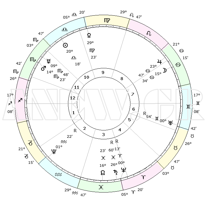 | ΘΕΣΕΙΣ ΠΛΑΝΗΤΩΝ ΑΣΤΡΟΛΟΓΙΚΟΥ ΧΑΡΤΗ ΤΗΣ ΣΤΙΓΜΗΣ ΑΥΤΗΣ | | Πλανήτης | Ζώδιο | Μοίρες | Δεκαήμ. | Σε οίκο | Απόκλιση | | Ακμές των οίκων | Ηλιος | Ζυγός | 20°12' | Τρίτο | 11 | 07 S 54 | | 1ος | 18°36' | Σκορπιός | Σελήνη | Καρκίνος | 14°14' | Δεύτερο | 8 | 27 N 19 | | 2ος | 18°24' | Τοξότης | Ερμής | Σκορπιός | 09°40' | Πρώτο | 12 | 16 S 10 | | 3ος | 22°22' | Αιγόκερως | Αφροδίτη | Παρθένος | 29°16' | Τρίτο | 10 | 01 N 40 | | 4ος | 27°53' | Υδροχόος | Αρης | Σκορπιός | 14°19' | Δεύτερο | 12 | 16 S 20 | | 5ος | 00°03' | Κριός | Δίας | Καρκίνος | 23°47' | Τρίτο | 9 | 21 N 23 | | 6ος | 26°38' | Κριός | Κρόνος | Ιχθείς | 27°00'R | Τρίτο | 4 | 03 S 29 | | 7ος | 18°36' | Ταύρος | Ουρανός | Δίδυμοι | 00°54'R | Πρώτο | 7 | 20 N 08 | | 8ος | 18°24' | Δίδυμοι | Ποσειδώνας | Κριός | 00°13'R | Πρώτο | 5 | 01 S 10 | | 9ος | 22°22' | Καρκίνος | Πλούτωνας | Υδροχόος | 01°22'R | Πρώτο | 3 | 23 S 32 | | 10ος | 27°53' | Λέων | Β. Δεσμός | Ιχθείς | 16°23' | Δεύτερο | 4 | 05 S 22 | | 11ος | 00°03' | Ζυγός | Ωροσκόπος | Σκορπιός | 18°36' | Δεύτερο | | | 12ος | 26°38' | Ζυγός | Μεσουράνημα | Λέων | 27°53' | Τρίτο | | | |