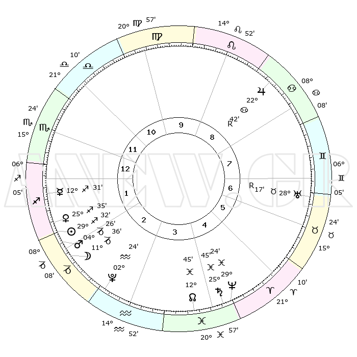 | | ΘΕΣΕΙΣ ΠΛΑΝΗΤΩΝ ΑΣΤΡΟΛΟΓΙΚΟΥ ΧΑΡΤΗ ΤΗΣ ΣΤΙΓΜΗΣ ΑΥΤΗΣ | | | | Πλανήτης | Ζώδιο | Μοίρες | Δεκαήμ. | Σε οίκο | Απόκλιση | | Ακμές των οίκων | | Ηλιος | Τοξότης | 29°24' | Τρίτο | 2 | 23 S 26 | | 1ος | 29°56' | Ζυγός | | Σελήνη | Αιγόκερως | 10°05' | Δεύτερο | 3 | 27 S 27 | | 2ος | 28°21' | Σκορπιός | | Ερμής | Τοξότης | 12°21' | Δεύτερο | 2 | 21 S 31 | | 3ος | 00°18' | Αιγόκερως | | Αφροδίτη | Τοξότης | 25°25' | Τρίτο | 2 | 23 S 26 | | 4ος | 04°29' | Υδροχόος | | Αρης | Αιγόκερως | 04°20' | Πρώτο | 3 | 24 S 11 | | 5ος | 07°24' | Ιχθείς | | Δίας | Καρκίνος | 22°43'R | Τρίτο | 9 | 21 N 44 | | 6ος | 06°05' | Κριός | | Κρόνος | Ιχθείς | 25°45' | Τρίτο | 5 | 03 S 48 | | 7ος | 29°56' | Κριός | | Ουρανός | Ταύρος | 28°17'R | Τρίτο | 7 | 19 N 35 | | 8ος | 28°21' | Ταύρος | | Ποσειδώνας | Ιχθείς | 29°24' | Τρίτο | 5 | 01 S 28 | | 9ος | 00°18' | Καρκίνος | | Πλούτωνας | Υδροχόος | 02°24' | Πρώτο | 3 | 23 S 17 | | 10ος | 04°29' | Λέων | | Β. Δεσμός | Ιχθείς | 12°45' | Δεύτερο | 5 | 06 S 46 | | 11ος | 07°24' | Παρθένος | | Ωροσκόπος | Ζυγός | 29°56' | Τρίτο | | | 12ος | 06°04' | Ζυγός | | Μεσουράνημα | Λέων | 04°29' | Πρώτο | | | |
