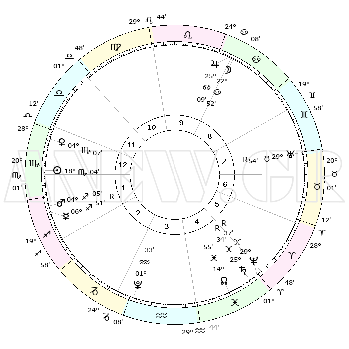 | | ΘΕΣΕΙΣ ΠΛΑΝΗΤΩΝ ΑΣΤΡΟΛΟΓΙΚΟΥ ΧΑΡΤΗ ΤΗΣ ΣΤΙΓΜΗΣ ΑΥΤΗΣ | | | | Πλανήτης | Ζώδιο | Μοίρες | Δεκαήμ. | Σε οίκο | Απόκλιση | | Ακμές των οίκων | | Ηλιος | Σκορπιός | 17°59' | Δεύτερο | 1 | 17 S 11 | | 1ος | 29°29' | Ζυγός | | Σελήνη | Καρκίνος | 21°53' | Τρίτο | 9 | 25 N 44 | | 2ος | 27°52' | Σκορπιός | | Ερμής | Τοξότης | 06°51'R | Πρώτο | 2 | 23 S 43 | | 3ος | 29°47' | Τοξότης | | Αφροδίτη | Σκορπιός | 04°01' | Πρώτο | 1 | 11 S 37 | | 4ος | 03°57' | Υδροχόος | | Αρης | Τοξότης | 04°02' | Πρώτο | 2 | 21 S 25 | | 5ος | 06°52' | Ιχθείς | | Δίας | Καρκίνος | 25°09' | Τρίτο | 9 | 21 N 12 | | 6ος | 05°35' | Κριός | | Κρόνος | Ιχθείς | 25°34'R | Τρίτο | 5 | 04 S 00 | | 7ος | 29°29' | Κριός | | Ουρανός | Ταύρος | 29°55'R | Τρίτο | 8 | 19 N 55 | | 8ος | 27°52' | Ταύρος | | Ποσειδώνας | Ιχθείς | 29°37'R | Τρίτο | 5 | 01 S 24 | | 9ος | 29°47' | Δίδυμοι | | Πλούτωνας | Υδροχόος | 01°33' | Πρώτο | 3 | 23 S 29 | | 10ος | 03°57' | Λέων | | Β. Δεσμός | Ιχθείς | 14°55' | Δεύτερο | 5 | 05 S 56 | | 11ος | 06°52' | Παρθένος | | Ωροσκόπος | Ζυγός | 29°29' | Τρίτο | | | 12ος | 05°35' | Ζυγός | | Μεσουράνημα | Λέων | 03°57' | Πρώτο | | | |