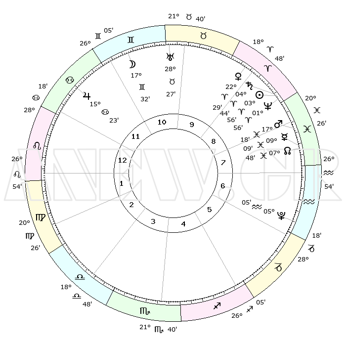 | | ΘΕΣΕΙΣ ΠΛΑΝΗΤΩΝ ΑΣΤΡΟΛΟΓΙΚΟΥ ΧΑΡΤΗ ΤΗΣ ΣΤΙΓΜΗΣ ΑΥΤΗΣ | | | | Πλανήτης | Ζώδιο | Μοίρες | Δεκαήμ. | Σε οίκο | Απόκλιση | | Ακμές των οίκων | | Ηλιος | Κριός | 03°52' | Πρώτο | 9 | 01 N 32 | | 1ος | 07°47' | Λέων | | Σελήνη | Δίδυμοι | 16°36' | Δεύτερο | 11 | 27 N 55 | | 2ος | 29°25' | Λέων | | Ερμής | Ιχθείς | 09°08' | Πρώτο | 8 | 08 S 02 | | 3ος | 25°32' | Παρθένος | | Αφροδίτη | Κριός | 22°24' | Τρίτο | 9 | 08 N 02 | | 4ος | 27°24' | Ζυγός | | Αρης | Ιχθείς | 17°15' | Δεύτερο | 8 | 06 S 01 | | 5ος | 03°08' | Τοξότης | | Δίας | Καρκίνος | 15°22' | Δεύτερο | 12 | 22 N 55 | | 6ος | 07°37' | Αιγόκερως | | Κρόνος | Κριός | 04°44' | Πρώτο | 9 | 00 S 04 | | 7ος | 07°47' | Υδροχόος | | Ουρανός | Ταύρος | 28°27' | Τρίτο | 10 | 19 N 38 | | 8ος | 29°25' | Υδροχόος | | Ποσειδώνας | Κριός | 01°56' | Πρώτο | 9 | 00 S 26 | | 9ος | 25°32' | Ιχθείς | | Πλούτωνας | Υδροχόος | 05°05' | Πρώτο | 6 | 22 S 48 | | 10ος | 27°24' | Κριός | | Β. Δεσμός | Ιχθείς | 07°48' | Πρώτο | 8 | 08 S 39 | | 11ος | 03°08' | Δίδυμοι | | Ωροσκόπος | Λέων | 07°47' | Πρώτο | | | 12ος | 07°37' | Καρκίνος | | Μεσουράνημα | Κριός | 27°24' | Τρίτο | | | |
