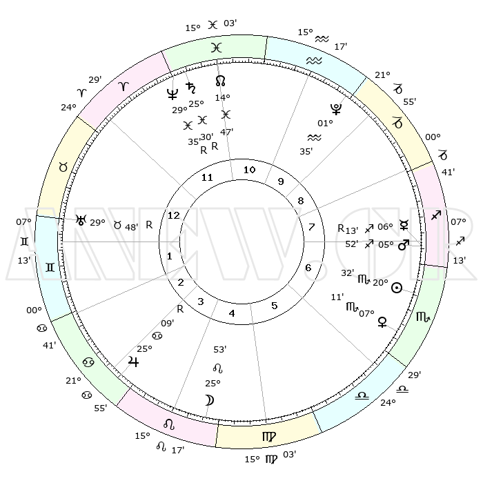 | | ΘΕΣΕΙΣ ΠΛΑΝΗΤΩΝ ΑΣΤΡΟΛΟΓΙΚΟΥ ΧΑΡΤΗ ΤΗΣ ΣΤΙΓΜΗΣ ΑΥΤΗΣ | | | | Πλανήτης | Ζώδιο | Μοίρες | Δεκαήμ. | Σε οίκο | Απόκλιση | | Ακμές των οίκων | | Ηλιος | Σκορπιός | 20°28' | Τρίτο | 7 | 17 S 52 | | 1ος | 06°14' | Ταύρος | | Σελήνη | Λέων | 25°00' | Τρίτο | 5 | 14 N 55 | | 2ος | 06°45' | Δίδυμοι | | Ερμής | Τοξότης | 06°15'R | Πρώτο | 7 | 23 S 09 | | 3ος | 29°42' | Δίδυμοι | | Αφροδίτη | Σκορπιός | 07°06' | Πρώτο | 7 | 12 S 41 | | 4ος | 21°27' | Καρκίνος | | Αρης | Τοξότης | 05°49' | Πρώτο | 7 | 21 S 46 | | 5ος | 16°31' | Λέων | | Δίας | Καρκίνος | 25°09'R | Τρίτο | 4 | 21 N 13 | | 6ος | 20°28' | Παρθένος | | Κρόνος | Ιχθείς | 25°30'R | Τρίτο | 12 | 04 S 01 | | 7ος | 06°14' | Σκορπιός | | Ουρανός | Ταύρος | 29°49'R | Τρίτο | 1 | 19 N 54 | | 8ος | 06°45' | Τοξότης | | Ποσειδώνας | Ιχθείς | 29°35'R | Τρίτο | 12 | 01 S 25 | | 9ος | 29°42' | Τοξότης | | Πλούτωνας | Υδροχόος | 01°35' | Πρώτο | 10 | 23 S 29 | | 10ος | 21°27' | Αιγόκερως | | Β. Δεσμός | Ιχθείς | 14°47' | Δεύτερο | 11 | 05 S 59 | | 11ος | 16°31' | Υδροχόος | | Ωροσκόπος | Ταύρος | 06°14' | Πρώτο | | | 12ος | 20°28' | Ιχθείς | | Μεσουράνημα | Αιγόκερως | 21°27' | Τρίτο | | | |