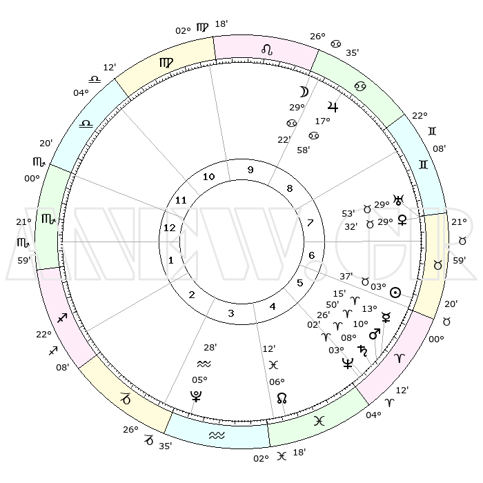 | | ΘΕΣΕΙΣ ΠΛΑΝΗΤΩΝ ΑΣΤΡΟΛΟΓΙΚΟΥ ΧΑΡΤΗ ΤΗΣ ΣΤΙΓΜΗΣ ΑΥΤΗΣ | | | | Πλανήτης | Ζώδιο | Μοίρες | Δεκαήμ. | Σε οίκο | Απόκλιση | | Ακμές των οίκων | | Ηλιος | Ταύρος | 03°34' | Πρώτο | 7 | 12 N 42 | | 1ος | 03°17' | Σκορπιός | | Σελήνη | Καρκίνος | 28°28' | Τρίτο | 9 | 23 N 36 | | 2ος | 01°54' | Τοξότης | | Ερμής | Κριός | 13°09' | Δεύτερο | 6 | 02 N 53 | | 3ος | 04°07' | Αιγόκερως | | Αφροδίτη | Ταύρος | 29°27' | Τρίτο | 7 | 20 N 35 | | 4ος | 08°32' | Υδροχόος | | Αρης | Κριός | 10°47' | Δεύτερο | 6 | 03 N 24 | | 5ος | 11°24' | Ιχθείς | | Δίας | Καρκίνος | 17°57' | Δεύτερο | 9 | 22 N 37 | | 6ος | 09°46' | Κριός | | Κρόνος | Κριός | 08°25' | Πρώτο | 5 | 01 N 21 | | 7ος | 03°17' | Ταύρος | | Ουρανός | Ταύρος | 29°53' | Τρίτο | 7 | 19 N 57 | | 8ος | 01°54' | Δίδυμοι | | Ποσειδώνας | Κριός | 03°02' | Πρώτο | 5 | 00 S 00 | | 9ος | 04°07' | Καρκίνος | | Πλούτωνας | Υδροχόος | 05°28' | Πρώτο | 3 | 22 S 48 | | 10ος | 08°32' | Λέων | | Β. Δεσμός | Ιχθείς | 06°12' | Πρώτο | 4 | 09 S 14 | | 11ος | 11°24' | Παρθένος | | Ωροσκόπος | Σκορπιός | 03°17' | Πρώτο | | | 12ος | 09°46' | Ζυγός | | Μεσουράνημα | Λέων | 08°32' | Πρώτο | | | |