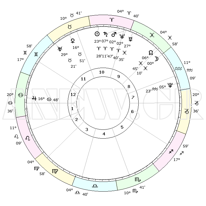 | | ΘΕΣΕΙΣ ΠΛΑΝΗΤΩΝ ΑΣΤΡΟΛΟΓΙΚΟΥ ΧΑΡΤΗ ΤΗΣ ΣΤΙΓΜΗΣ ΑΥΤΗΣ | | | | Πλανήτης | Ζώδιο | Μοίρες | Δεκαήμ. | Σε οίκο | Απόκλιση | | Ακμές των οίκων | | Ηλιος | Κριός | 23°24' | Τρίτο | 11 | 09 N 05 | | 1ος | 00°12' | Καρκίνος | | Σελήνη | Υδροχόος | 29°19' | Τρίτο | 9 | 12 S 27 | | 2ος | 20°58' | Καρκίνος | | Ερμής | Ιχθείς | 27°30' | Τρίτο | 10 | 03 S 19 | | 3ος | 12°47' | Λέων | | Αφροδίτη | Ταύρος | 16°47' | Δεύτερο | 11 | 16 N 56 | | 4ος | 09°08' | Παρθένος | | Αρης | Κριός | 02°44' | Πρώτο | 10 | 00 N 11 | | 5ος | 13°06' | Ζυγός | | Δίας | Καρκίνος | 16°48' | Δεύτερο | 1 | 22 N 45 | | 6ος | 23°05' | Σκορπιός | | Κρόνος | Κριός | 07°11' | Πρώτο | 10 | 00 N 53 | | 7ος | 00°12' | Αιγόκερως | | Ουρανός | Ταύρος | 29°20' | Τρίτο | 12 | 19 N 50 | | 8ος | 20°58' | Αιγόκερως | | Ποσειδώνας | Κριός | 02°40' | Πρώτο | 10 | 00 S 09 | | 9ος | 12°47' | Υδροχόος | | Πλούτωνας | Υδροχόος | 05°23' | Πρώτο | 8 | 22 S 47 | | 10ος | 09°08' | Ιχθείς | | Β. Δεσμός | Ιχθείς | 06°45' | Πρώτο | 9 | 09 S 02 | | 11ος | 13°06' | Κριός | | Ωροσκόπος | Καρκίνος | 00°12' | Πρώτο | | | 12ος | 23°05' | Ταύρος | | Μεσουράνημα | Ιχθείς | 09°08' | Πρώτο | | | |