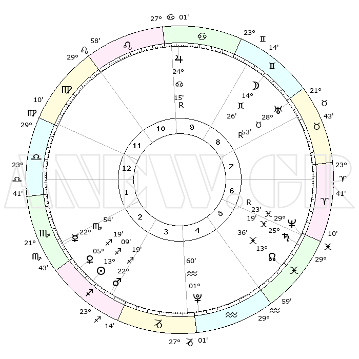 | | ΘΕΣΕΙΣ ΠΛΑΝΗΤΩΝ ΑΣΤΡΟΛΟΓΙΚΟΥ ΧΑΡΤΗ ΤΗΣ ΣΤΙΓΜΗΣ ΑΥΤΗΣ | | | | Πλανήτης | Ζώδιο | Μοίρες | Δεκαήμ. | Σε οίκο | Απόκλιση | | Ακμές των οίκων | | Ηλιος | Τοξότης | 13°07' | Δεύτερο | 3 | 22 S 22 | | 1ος | 12°41' | Ζυγός | | Σελήνη | Δίδυμοι | 13°52' | Δεύτερο | 9 | 27 N 25 | | 2ος | 10°06' | Σκορπιός | | Ερμής | Σκορπιός | 22°53' | Τρίτο | 2 | 16 S 02 | | 3ος | 11°02' | Τοξότης | | Αφροδίτη | Τοξότης | 05°16' | Πρώτο | 2 | 20 S 38 | | 4ος | 14°18' | Αιγόκερως | | Αρης | Τοξότης | 22°18' | Τρίτο | 3 | 23 S 54 | | 5ος | 17°14' | Υδροχόος | | Δίας | Καρκίνος | 24°15'R | Τρίτο | 10 | 21 N 26 | | 6ος | 17°07' | Ιχθείς | | Κρόνος | Ιχθείς | 25°19' | Τρίτο | 6 | 04 S 01 | | 7ος | 12°41' | Κριός | | Ουρανός | Ταύρος | 28°53'R | Τρίτο | 8 | 19 N 42 | | 8ος | 10°06' | Ταύρος | | Ποσειδώνας | Ιχθείς | 29°23'R | Τρίτο | 6 | 01 S 29 | | 9ος | 11°02' | Δίδυμοι | | Πλούτωνας | Υδροχόος | 01°60' | Πρώτο | 4 | 23 S 23 | | 10ος | 14°18' | Καρκίνος | | Β. Δεσμός | Ιχθείς | 13°36' | Δεύτερο | 5 | 06 S 27 | | 11ος | 17°14' | Λέων | | Ωροσκόπος | Ζυγός | 12°41' | Δεύτερο | | | 12ος | 17°07' | Παρθένος | | Μεσουράνημα | Καρκίνος | 14°18' | Δεύτερο | | | |