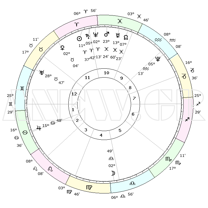 | | ΘΕΣΕΙΣ ΠΛΑΝΗΤΩΝ ΑΣΤΡΟΛΟΓΙΚΟΥ ΧΑΡΤΗ ΤΗΣ ΣΤΙΓΜΗΣ ΑΥΤΗΣ | | | | Πλανήτης | Ζώδιο | Μοίρες | Δεκαήμ. | Σε οίκο | Απόκλιση | | Ακμές των οίκων | | Ηλιος | Κριός | 11°33' | Δεύτερο | 11 | 04 N 34 | | 1ος | 01°23' | Δίδυμοι | | Σελήνη | Ζυγός | 02°01' | Πρώτο | 5 | 02 S 41 | | 2ος | 25°55' | Δίδυμοι | | Ερμής | Ιχθείς | 13°56' | Δεύτερο | 11 | 07 S 34 | | 3ος | 17°17' | Καρκίνος | | Αφροδίτη | Ταύρος | 01°59' | Πρώτο | 12 | 11 N 45 | | 4ος | 10°09' | Λέων | | Αρης | Ιχθείς | 23°21' | Τρίτο | 11 | 03 S 36 | | 5ος | 08°52' | Παρθένος | | Δίας | Καρκίνος | 15°48' | Δεύτερο | 2 | 22 N 52 | | 6ος | 17°31' | Ζυγός | | Κρόνος | Κριός | 05°42' | Πρώτο | 11 | 00 N 18 | | 7ος | 01°23' | Τοξότης | | Ουρανός | Ταύρος | 28°47' | Τρίτο | 12 | 19 N 43 | | 8ος | 25°55' | Τοξότης | | Ποσειδώνας | Κριός | 02°13' | Πρώτο | 11 | 00 S 19 | | 9ος | 17°17' | Αιγόκερως | | Πλούτωνας | Υδροχόος | 05°13' | Πρώτο | 9 | 22 S 47 | | 10ος | 10°09' | Υδροχόος | | Β. Δεσμός | Ιχθείς | 07°23' | Πρώτο | 10 | 08 S 48 | | 11ος | 08°52' | Ιχθείς | | Ωροσκόπος | Δίδυμοι | 01°23' | Πρώτο | | | 12ος | 17°31' | Κριός | | Μεσουράνημα | Υδροχόος | 10°09' | Δεύτερο | | | |