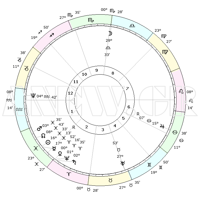 | | ΘΕΣΕΙΣ ΠΛΑΝΗΤΩΝ ΑΣΤΡΟΛΟΓΙΚΟΥ ΧΑΡΤΗ ΤΗΣ ΣΤΙΓΜΗΣ ΑΥΤΗΣ | | | | Πλανήτης | Ζώδιο | Μοίρες | Δεκαήμ. | Σε οίκο | Απόκλιση | | Ακμές των οίκων | | Ηλιος | Ιχθείς | 16°27' | Δεύτερο | 3 | 05 S 21 | | 1ος | 26°48' | Τοξότης | | Σελήνη | Ζυγός | 28°12' | Τρίτο | 10 | 14 S 34 | | 2ος | 03°09' | Υδροχόος | | Ερμής | Ιχθείς | 17°19'R | Δεύτερο | 3 | 01 S 38 | | 3ος | 12°53' | Ιχθείς | | Αφροδίτη | Κριός | 00°43' | Πρώτο | 3 | 00 S 51 | | 4ος | 17°19' | Κριός | | Αρης | Ιχθείς | 03°30' | Πρώτο | 2 | 11 S 14 | | 5ος | 14°09' | Ταύρος | | Δίας | Καρκίνος | 15°07'R | Δεύτερο | 7 | 22 N 56 | | 6ος | 06°10' | Δίδυμοι | | Κρόνος | Κριός | 02°34' | Πρώτο | 3 | 00 S 56 | | 7ος | 26°48' | Δίδυμοι | | Ουρανός | Ταύρος | 27°53' | Τρίτο | 5 | 19 N 30 | | 8ος | 03°09' | Λέων | | Ποσειδώνας | Κριός | 01°16' | Πρώτο | 3 | 00 S 42 | | 9ος | 12°53' | Παρθένος | | Πλούτωνας | Υδροχόος | 04°42' | Πρώτο | 2 | 22 S 51 | | 10ος | 17°19' | Ζυγός | | Β. Δεσμός | Ιχθείς | 08°44' | Πρώτο | 2 | 08 S 18 | | 11ος | 14°09' | Σκορπιός | | Ωροσκόπος | Τοξότης | 26°48' | Τρίτο | | | 12ος | 06°10' | Τοξότης | | Μεσουράνημα | Ζυγός | 17°19' | Δεύτερο | | | |