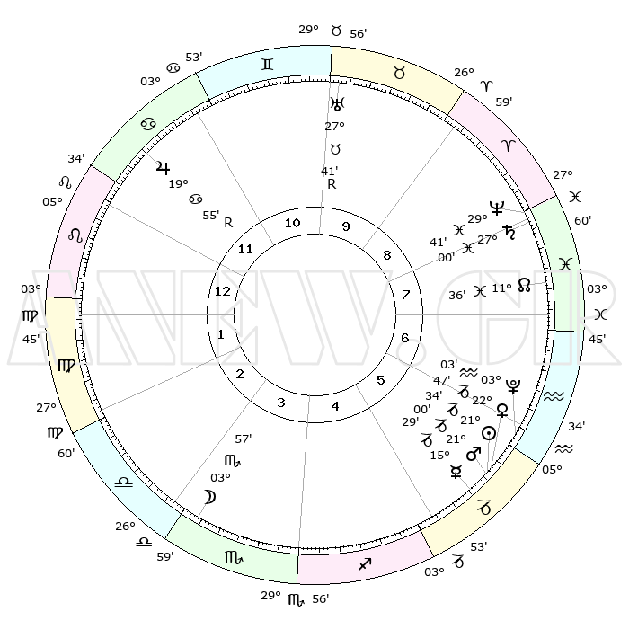 | | ΘΕΣΕΙΣ ΠΛΑΝΗΤΩΝ ΑΣΤΡΟΛΟΓΙΚΟΥ ΧΑΡΤΗ ΤΗΣ ΣΤΙΓΜΗΣ ΑΥΤΗΣ | | | | Πλανήτης | Ζώδιο | Μοίρες | Δεκαήμ. | Σε οίκο | Απόκλιση | | Ακμές των οίκων | | Ηλιος | Αιγόκερως | 21°17' | Τρίτο | 8 | 21 S 45 | | 1ος | 09°24' | Δίδυμοι | | Σελήνη | Σκορπιός | 00°42' | Πρώτο | 6 | 15 S 25 | | 2ος | 02°29' | Καρκίνος | | Ερμής | Αιγόκερως | 15°03' | Δεύτερο | 8 | 24 S 08 | | 3ος | 23°42' | Καρκίνος | | Αφροδίτη | Αιγόκερως | 22°27' | Τρίτο | 8 | 22 S 26 | | 4ος | 17°17' | Λέων | | Αρης | Αιγόκερως | 20°47' | Τρίτο | 8 | 22 S 46 | | 5ος | 17°27' | Παρθένος | | Δίας | Καρκίνος | 19°57'R | Δεύτερο | 2 | 22 N 13 | | 6ος | 27°07' | Ζυγός | | Κρόνος | Ιχθείς | 26°59' | Τρίτο | 11 | 03 S 15 | | 7ος | 09°24' | Τοξότης | | Ουρανός | Ταύρος | 27°42'R | Τρίτο | 12 | 19 N 27 | | 8ος | 02°29' | Αιγόκερως | | Ποσειδώνας | Ιχθείς | 29°40' | Τρίτο | 11 | 01 S 21 | | 9ος | 23°42' | Αιγόκερως | | Πλούτωνας | Υδροχόος | 03°03' | Πρώτο | 9 | 23 S 09 | | 10ος | 17°17' | Υδροχόος | | Β. Δεσμός | Ιχθείς | 11°37' | Δεύτερο | 10 | 07 S 12 | | 11ος | 17°27' | Ιχθείς | | Ωροσκόπος | Δίδυμοι | 09°24' | Πρώτο | | | 12ος | 27°07' | Κριός | | Μεσουράνημα | Υδροχόος | 17°17' | Δεύτερο | | | |