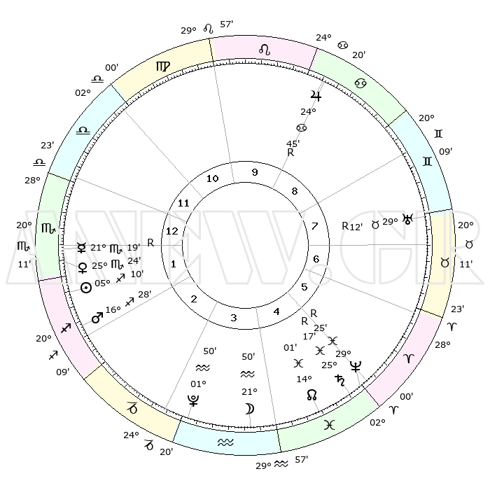 | | ΘΕΣΕΙΣ ΠΛΑΝΗΤΩΝ ΑΣΤΡΟΛΟΓΙΚΟΥ ΧΑΡΤΗ ΤΗΣ ΣΤΙΓΜΗΣ ΑΥΤΗΣ | | | | Πλανήτης | Ζώδιο | Μοίρες | Δεκαήμ. | Σε οίκο | Απόκλιση | | Ακμές των οίκων | | Ηλιος | Τοξότης | 05°08' | Πρώτο | 1 | 21 S 09 | | 1ος | 10°57' | Σκορπιός | | Σελήνη | Υδροχόος | 21°25' | Τρίτο | 4 | 16 S 13 | | 2ος | 10°06' | Τοξότης | | Ερμής | Σκορπιός | 21°20'R | Τρίτο | 1 | 15 S 53 | | 3ος | 13°06' | Αιγόκερως | | Αφροδίτη | Σκορπιός | 25°21' | Τρίτο | 1 | 18 S 17 | | 4ος | 18°04' | Υδροχόος | | Αρης | Τοξότης | 16°27' | Δεύτερο | 2 | 23 S 22 | | 5ος | 20°42' | Ιχθείς | | Δίας | Καρκίνος | 24°45'R | Τρίτο | 9 | 21 N 19 | | 6ος | 18°14' | Κριός | | Κρόνος | Ιχθείς | 25°17'R | Τρίτο | 5 | 04 S 04 | | 7ος | 10°57' | Ταύρος | | Ουρανός | Ταύρος | 29°12'R | Τρίτο | 7 | 19 N 46 | | 8ος | 10°06' | Δίδυμοι | | Ποσειδώνας | Ιχθείς | 29°25'R | Τρίτο | 5 | 01 S 28 | | 9ος | 13°06' | Καρκίνος | | Πλούτωνας | Υδροχόος | 01°49' | Πρώτο | 3 | 23 S 25 | | 10ος | 18°04' | Λέων | | Β. Δεσμός | Ιχθείς | 14°01' | Δεύτερο | 4 | 06 S 17 | | 11ος | 20°42' | Παρθένος | | Ωροσκόπος | Σκορπιός | 10°57' | Δεύτερο | | | 12ος | 18°14' | Ζυγός | | Μεσουράνημα | Λέων | 18°04' | Δεύτερο | | | |