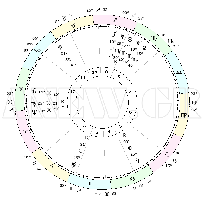 | | ΘΕΣΕΙΣ ΠΛΑΝΗΤΩΝ ΑΣΤΡΟΛΟΓΙΚΟΥ ΧΑΡΤΗ ΤΗΣ ΣΤΙΓΜΗΣ ΑΥΤΗΣ | | | | Πλανήτης | Ζώδιο | Μοίρες | Δεκαήμ. | Σε οίκο | Απόκλιση | | Ακμές των οίκων | | Ηλιος | Σκορπιός | 27°21' | Τρίτο | 9 | 19 S 34 | | 1ος | 18°60' | Υδροχόος | | Σελήνη | Σκορπιός | 18°17' | Δεύτερο | 9 | 21 S 33 | | 2ος | 04°48' | Κριός | | Ερμής | Σκορπιός | 29°35'R | Τρίτο | 9 | 19 S 50 | | 3ος | 09°43' | Ταύρος | | Αφροδίτη | Σκορπιός | 15°42' | Δεύτερο | 9 | 15 S 30 | | 4ος | 05°21' | Δίδυμοι | | Αρης | Τοξότης | 10°48' | Δεύτερο | 10 | 22 S 37 | | 5ος | 27°12' | Δίδυμοι | | Δίας | Καρκίνος | 25°03'R | Τρίτο | 6 | 21 N 15 | | 6ος | 19°45' | Καρκίνος | | Κρόνος | Ιχθείς | 25°21'R | Τρίτο | 1 | 04 S 04 | | 7ος | 18°60' | Λέων | | Ουρανός | Ταύρος | 29°32'R | Τρίτο | 3 | 19 N 50 | | 8ος | 04°48' | Ζυγός | | Ποσειδώνας | Ιχθείς | 29°30'R | Τρίτο | 1 | 01 S 27 | | 9ος | 09°43' | Σκορπιός | | Πλούτωνας | Υδροχόος | 01°41' | Πρώτο | 12 | 23 S 27 | | 10ος | 05°21' | Τοξότης | | Β. Δεσμός | Ιχθείς | 14°25' | Δεύτερο | 1 | 06 S 08 | | 11ος | 27°12' | Τοξότης | | Ωροσκόπος | Υδροχόος | 18°60' | Δεύτερο | | | 12ος | 19°45' | Αιγόκερως | | Μεσουράνημα | Τοξότης | 05°21' | Πρώτο | | | |