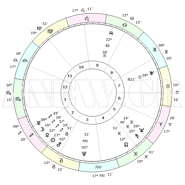 | | ΘΕΣΕΙΣ ΠΛΑΝΗΤΩΝ ΑΣΤΡΟΛΟΓΙΚΟΥ ΧΑΡΤΗ ΤΗΣ ΣΤΙΓΜΗΣ ΑΥΤΗΣ | | | | Πλανήτης | Ζώδιο | Μοίρες | Δεκαήμ. | Σε οίκο | Απόκλιση | | Ακμές των οίκων | | Ηλιος | Τοξότης | 26°60' | Τρίτο | 6 | 23 S 24 | | 1ος | 12°60' | Καρκίνος | | Σελήνη | Τοξότης | 11°42' | Δεύτερο | 6 | 27 S 08 | | 2ος | 03°25' | Λέων | | Ερμής | Τοξότης | 08°59' | Πρώτο | 6 | 20 S 44 | | 3ος | 26°21' | Λέων | | Αφροδίτη | Τοξότης | 22°27' | Τρίτο | 6 | 23 S 12 | | 4ος | 24°49' | Παρθένος | | Αρης | Αιγόκερως | 02°33' | Πρώτο | 6 | 24 S 13 | | 5ος | 00°23' | Σκορπιός | | Δίας | Καρκίνος | 22°58'R | Τρίτο | 1 | 21 N 41 | | 6ος | 08°53' | Τοξότης | | Κρόνος | Ιχθείς | 25°39' | Τρίτο | 10 | 03 S 51 | | 7ος | 12°60' | Αιγόκερως | | Ουρανός | Ταύρος | 28°22'R | Τρίτο | 11 | 19 N 36 | | 8ος | 03°25' | Υδροχόος | | Ποσειδώνας | Ιχθείς | 29°24' | Τρίτο | 10 | 01 S 28 | | 9ος | 26°21' | Υδροχόος | | Πλούτωνας | Υδροχόος | 02°20' | Πρώτο | 7 | 23 S 18 | | 10ος | 24°49' | Ιχθείς | | Β. Δεσμός | Ιχθείς | 12°53' | Δεύτερο | 9 | 06 S 44 | | 11ος | 00°23' | Ταύρος | | Ωροσκόπος | Καρκίνος | 12°60' | Δεύτερο | | | 12ος | 08°53' | Δίδυμοι | | Μεσουράνημα | Ιχθείς | 24°49' | Τρίτο | | | |