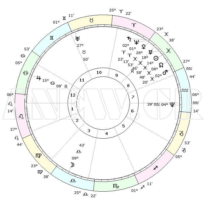 | | ΘΕΣΕΙΣ ΠΛΑΝΗΤΩΝ ΑΣΤΡΟΛΟΓΙΚΟΥ ΧΑΡΤΗ ΤΗΣ ΣΤΙΓΜΗΣ ΑΥΤΗΣ | | | | Πλανήτης | Ζώδιο | Μοίρες | Δεκαήμ. | Σε οίκο | Απόκλιση | | Ακμές των οίκων | | Ηλιος | Ιχθείς | 14°54' | Δεύτερο | 9 | 05 S 57 | | 1ος | 16°45' | Καρκίνος | | Σελήνη | Ζυγός | 08°53' | Πρώτο | 4 | 05 S 56 | | 2ος | 07°13' | Λέων | | Ερμής | Ιχθείς | 18°48'R | Δεύτερο | 9 | 01 S 02 | | 3ος | 00°34' | Παρθένος | | Αφροδίτη | Ιχθείς | 28°48' | Τρίτο | 9 | 01 S 39 | | 4ος | 29°40' | Παρθένος | | Αρης | Ιχθείς | 02°17' | Πρώτο | 9 | 11 S 41 | | 5ος | 05°30' | Σκορπιός | | Δίας | Καρκίνος | 15°08'R | Δεύτερο | 12 | 22 N 55 | | 6ος | 13°25' | Τοξότης | | Κρόνος | Κριός | 02°23' | Πρώτο | 10 | 01 S 01 | | 7ος | 16°45' | Αιγόκερως | | Ουρανός | Ταύρος | 27°50' | Τρίτο | 11 | 19 N 30 | | 8ος | 07°13' | Υδροχόος | | Ποσειδώνας | Κριός | 01°13' | Πρώτο | 10 | 00 S 43 | | 9ος | 00°34' | Ιχθείς | | Πλούτωνας | Υδροχόος | 04°39' | Πρώτο | 7 | 22 S 51 | | 10ος | 29°40' | Ιχθείς | | Β. Δεσμός | Ιχθείς | 08°48' | Πρώτο | 9 | 08 S 16 | | 11ος | 05°30' | Ταύρος | | Ωροσκόπος | Καρκίνος | 16°45' | Δεύτερο | | | 12ος | 13°25' | Δίδυμοι | | Μεσουράνημα | Ιχθείς | 29°40' | Τρίτο | | | |