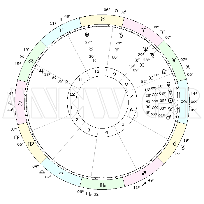 | | ΘΕΣΕΙΣ ΠΛΑΝΗΤΩΝ ΑΣΤΡΟΛΟΓΙΚΟΥ ΧΑΡΤΗ ΤΗΣ ΣΤΙΓΜΗΣ ΑΥΤΗΣ | | | | Πλανήτης | Ζώδιο | Μοίρες | Δεκαήμ. | Σε οίκο | Απόκλιση | | Ακμές των οίκων | | Ηλιος | Υδροχόος | 05°39' | Πρώτο | 7 | 18 S 51 | | 1ος | 27°27' | Καρκίνος | | Σελήνη | Κριός | 28°10' | Τρίτο | 10 | 14 N 29 | | 2ος | 18°20' | Λέων | | Ερμής | Υδροχόος | 08°22' | Πρώτο | 7 | 20 S 11 | | 3ος | 13°02' | Παρθένος | | Αφροδίτη | Υδροχόος | 10°11' | Δεύτερο | 7 | 18 S 53 | | 4ος | 13°44' | Ζυγός | | Αρης | Υδροχόος | 01°45' | Πρώτο | 7 | 20 S 45 | | 5ος | 19°49' | Σκορπιός | | Δίας | Καρκίνος | 18°06'R | Δεύτερο | 12 | 22 N 30 | | 6ος | 25°57' | Τοξότης | | Κρόνος | Ιχθείς | 28°09' | Τρίτο | 9 | 02 S 45 | | 7ος | 27°27' | Αιγόκερως | | Ουρανός | Ταύρος | 27°30'R | Τρίτο | 11 | 19 N 25 | | 8ος | 18°20' | Υδροχόος | | Ποσειδώνας | Ιχθείς | 29°59' | Τρίτο | 9 | 01 S 13 | | 9ος | 13°02' | Ιχθείς | | Πλούτωνας | Υδροχόος | 03°30' | Πρώτο | 7 | 23 S 04 | | 10ος | 13°44' | Κριός | | Β. Δεσμός | Ιχθείς | 10°52' | Δεύτερο | 8 | 07 S 29 | | 11ος | 19°49' | Ταύρος | | Ωροσκόπος | Καρκίνος | 27°27' | Τρίτο | | | 12ος | 25°57' | Δίδυμοι | | Μεσουράνημα | Κριός | 13°44' | Δεύτερο | | | |
