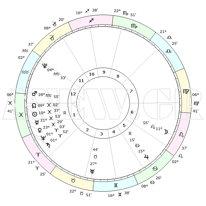 | | ΘΕΣΕΙΣ ΠΛΑΝΗΤΩΝ ΑΣΤΡΟΛΟΓΙΚΟΥ ΧΑΡΤΗ ΤΗΣ ΣΤΙΓΜΗΣ ΑΥΤΗΣ | | | | Πλανήτης | Ζώδιο | Μοίρες | Δεκαήμ. | Σε οίκο | Απόκλιση | | Ακμές των οίκων | | Ηλιος | Ιχθείς | 10°33' | Δεύτερο | 1 | 07 S 37 | | 1ος | 05°32' | Υδροχόος | | Σελήνη | Λέων | 11°03' | Δεύτερο | 7 | 19 N 50 | | 2ος | 20°26' | Ιχθείς | | Ερμής | Ιχθείς | 21°55'R | Τρίτο | 2 | 00 S 09 | | 3ος | 27°57' | Κριός | | Αφροδίτη | Ιχθείς | 23°24' | Τρίτο | 2 | 03 S 52 | | 4ος | 25°30' | Ταύρος | | Αρης | Υδροχόος | 28°52' | Τρίτο | 1 | 12 S 54 | | 5ος | 17°54' | Δίδυμοι | | Δίας | Καρκίνος | 15°15'R | Δεύτερο | 6 | 22 N 54 | | 6ος | 09°33' | Καρκίνος | | Κρόνος | Κριός | 01°51' | Πρώτο | 2 | 01 S 13 | | 7ος | 05°32' | Λέων | | Ουρανός | Ταύρος | 27°44' | Τρίτο | 4 | 19 N 28 | | 8ος | 20°26' | Παρθένος | | Ποσειδώνας | Κριός | 01°03' | Πρώτο | 2 | 00 S 47 | | 9ος | 27°57' | Ζυγός | | Πλούτωνας | Υδροχόος | 04°32' | Πρώτο | 12 | 22 S 52 | | 10ος | 25°30' | Σκορπιός | | Β. Δεσμός | Ιχθείς | 09°02' | Πρώτο | 1 | 08 S 11 | | 11ος | 17°54' | Τοξότης | | Ωροσκόπος | Υδροχόος | 05°32' | Πρώτο | | | 12ος | 09°33' | Αιγόκερως | | Μεσουράνημα | Σκορπιός | 25°30' | Τρίτο | | | |