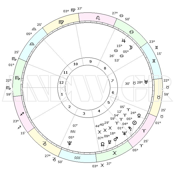 | | ΘΕΣΕΙΣ ΠΛΑΝΗΤΩΝ ΑΣΤΡΟΛΟΓΙΚΟΥ ΧΑΡΤΗ ΤΗΣ ΣΤΙΓΜΗΣ ΑΥΤΗΣ | | | | Πλανήτης | Ζώδιο | Μοίρες | Δεκαήμ. | Σε οίκο | Απόκλιση | | Ακμές των οίκων | | Ηλιος | Κριός | 05°09' | Πρώτο | 5 | 02 N 03 | | 1ος | 05°41' | Σκορπιός | | Σελήνη | Καρκίνος | 05°03' | Πρώτο | 8 | 28 N 01 | | 2ος | 04°28' | Τοξότης | | Ερμής | Ιχθείς | 09°38' | Πρώτο | 4 | 08 S 06 | | 3ος | 06°55' | Αιγόκερως | | Αφροδίτη | Κριός | 24°00' | Τρίτο | 6 | 08 N 40 | | 4ος | 11°30' | Υδροχόος | | Αρης | Ιχθείς | 18°16' | Δεύτερο | 5 | 05 S 37 | | 5ος | 14°19' | Ιχθείς | | Δίας | Καρκίνος | 15°26' | Δεύτερο | 9 | 22 N 54 | | 6ος | 12°26' | Κριός | | Κρόνος | Κριός | 04°53' | Πρώτο | 5 | 00 S 01 | | 7ος | 05°41' | Ταύρος | | Ουρανός | Ταύρος | 28°30' | Τρίτο | 7 | 19 N 39 | | 8ος | 04°28' | Δίδυμοι | | Ποσειδώνας | Κριός | 01°59' | Πρώτο | 5 | 00 S 25 | | 9ος | 06°55' | Καρκίνος | | Πλούτωνας | Υδροχόος | 05°07' | Πρώτο | 3 | 22 S 48 | | 10ος | 11°30' | Λέων | | Β. Δεσμός | Ιχθείς | 07°44' | Πρώτο | 4 | 08 S 40 | | 11ος | 14°19' | Παρθένος | | Ωροσκόπος | Σκορπιός | 05°41' | Πρώτο | | | 12ος | 12°26' | Ζυγός | | Μεσουράνημα | Λέων | 11°30' | Δεύτερο | | | |