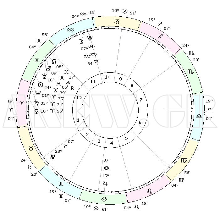 | | ΘΕΣΕΙΣ ΠΛΑΝΗΤΩΝ ΑΣΤΡΟΛΟΓΙΚΟΥ ΧΑΡΤΗ ΤΗΣ ΣΤΙΓΜΗΣ ΑΥΤΗΣ | | | | Πλανήτης | Ζώδιο | Μοίρες | Δεκαήμ. | Σε οίκο | Απόκλιση | | Ακμές των οίκων | | Ηλιος | Ιχθείς | 24°36' | Τρίτο | 1 | 02 S 09 | | 1ος | 15°48' | Ιχθείς | | Σελήνη | Υδροχόος | 06°50' | Πρώτο | 11 | 21 S 16 | | 2ος | 29°07' | Κριός | | Ερμής | Ιχθείς | 10°08'R | Δεύτερο | 12 | 05 S 34 | | 3ος | 28°52' | Ταύρος | | Αφροδίτη | Κριός | 10°52' | Δεύτερο | 1 | 03 N 20 | | 4ος | 21°58' | Δίδυμοι | | Αρης | Ιχθείς | 09°55' | Πρώτο | 12 | 08 S 51 | | 5ος | 13°48' | Καρκίνος | | Δίας | Καρκίνος | 15°07' | Δεύτερο | 5 | 22 N 56 | | 6ος | 09°11' | Λέων | | Κρόνος | Κριός | 03°34' | Πρώτο | 1 | 00 S 32 | | 7ος | 15°48' | Παρθένος | | Ουρανός | Ταύρος | 28°07' | Τρίτο | 2 | 19 N 34 | | 8ος | 29°07' | Ζυγός | | Ποσειδώνας | Κριός | 01°34' | Πρώτο | 1 | 00 S 34 | | 9ος | 28°52' | Σκορπιός | | Πλούτωνας | Υδροχόος | 04°53' | Πρώτο | 11 | 22 S 49 | | 10ος | 21°58' | Τοξότης | | Β. Δεσμός | Ιχθείς | 08°18' | Πρώτο | 12 | 08 S 27 | | 11ος | 13°48' | Αιγόκερως | | Ωροσκόπος | Ιχθείς | 15°48' | Δεύτερο | | | 12ος | 09°11' | Υδροχόος | | Μεσουράνημα | Τοξότης | 21°58' | Τρίτο | | | |