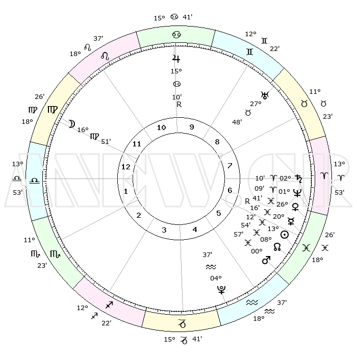 | | ΘΕΣΕΙΣ ΠΛΑΝΗΤΩΝ ΑΣΤΡΟΛΟΓΙΚΟΥ ΧΑΡΤΗ ΤΗΣ ΣΤΙΓΜΗΣ ΑΥΤΗΣ | | | | Πλανήτης | Ζώδιο | Μοίρες | Δεκαήμ. | Σε οίκο | Απόκλιση | | Ακμές των οίκων | | Ηλιος | Ιχθείς | 13°09' | Δεύτερο | 6 | 06 S 37 | | 1ος | 28°20' | Παρθένος | | Σελήνη | Παρθένος | 16°09' | Δεύτερο | 12 | 04 N 51 | | 2ος | 24°48' | Ζυγός | | Ερμής | Ιχθείς | 20°18'R | Τρίτο | 6 | 00 S 31 | | 3ος | 25°10' | Σκορπιός | | Αφροδίτη | Ιχθείς | 26°38' | Τρίτο | 6 | 02 S 33 | | 4ος | 28°08' | Τοξότης | | Αρης | Ιχθείς | 00°54' | Πρώτο | 5 | 12 S 10 | | 5ος | 01°08' | Υδροχόος | | Δίας | Καρκίνος | 15°10'R | Δεύτερο | 10 | 22 N 55 | | 6ος | 01°38' | Ιχθείς | | Κρόνος | Κριός | 02°10' | Πρώτο | 7 | 01 S 06 | | 7ος | 28°20' | Ιχθείς | | Ουρανός | Ταύρος | 27°48' | Τρίτο | 9 | 19 N 29 | | 8ος | 24°48' | Κριός | | Ποσειδώνας | Κριός | 01°09' | Πρώτο | 7 | 00 S 45 | | 9ος | 25°10' | Ταύρος | | Πλούτωνας | Υδροχόος | 04°37' | Πρώτο | 5 | 22 S 52 | | 10ος | 28°08' | Δίδυμοι | | Β. Δεσμός | Ιχθείς | 08°54' | Πρώτο | 6 | 08 S 14 | | 11ος | 01°08' | Λέων | | Ωροσκόπος | Παρθένος | 28°20' | Τρίτο | | | 12ος | 01°38' | Παρθένος | | Μεσουράνημα | Δίδυμοι | 28°08' | Τρίτο | | | |