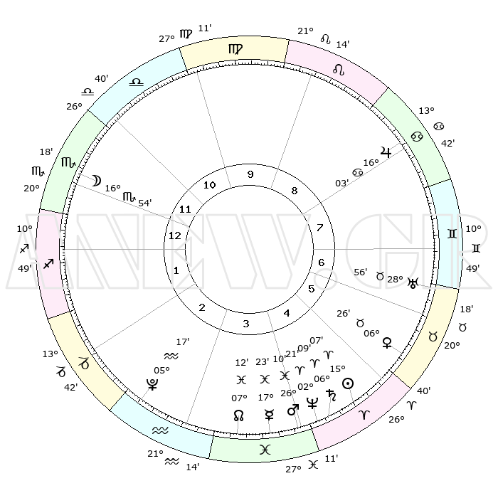 | | ΘΕΣΕΙΣ ΠΛΑΝΗΤΩΝ ΑΣΤΡΟΛΟΓΙΚΟΥ ΧΑΡΤΗ ΤΗΣ ΣΤΙΓΜΗΣ ΑΥΤΗΣ | | | | Πλανήτης | Ζώδιο | Μοίρες | Δεκαήμ. | Σε οίκο | Απόκλιση | | Ακμές των οίκων | | Ηλιος | Κριός | 14°58' | Δεύτερο | 6 | 05 N 54 | | 1ος | 27°17' | Ζυγός | | Σελήνη | Σκορπιός | 15°05' | Δεύτερο | 1 | 20 S 53 | | 2ος | 25°32' | Σκορπιός | | Ερμής | Ιχθείς | 17°13' | Δεύτερο | 5 | 06 S 44 | | 3ος | 27°17' | Τοξότης | | Αφροδίτη | Ταύρος | 06°15' | Πρώτο | 7 | 13 N 20 | | 4ος | 01°17' | Υδροχόος | | Αρης | Ιχθείς | 26°03' | Τρίτο | 5 | 02 S 31 | | 5ος | 04°14' | Ιχθείς | | Δίας | Καρκίνος | 16°03' | Δεύτερο | 9 | 22 N 50 | | 6ος | 03°08' | Κριός | | Κρόνος | Κριός | 06°08' | Πρώτο | 6 | 00 N 28 | | 7ος | 27°16' | Κριός | | Ουρανός | Ταύρος | 28°56' | Τρίτο | 8 | 19 N 45 | | 8ος | 25°32' | Ταύρος | | Ποσειδώνας | Κριός | 02°21' | Πρώτο | 5 | 00 S 16 | | 9ος | 27°17' | Δίδυμοι | | Πλούτωνας | Υδροχόος | 05°16' | Πρώτο | 4 | 22 S 47 | | 10ος | 01°17' | Λέων | | Β. Δεσμός | Ιχθείς | 07°12' | Πρώτο | 5 | 08 S 52 | | 11ος | 04°14' | Παρθένος | | Ωροσκόπος | Ζυγός | 27°17' | Τρίτο | | | 12ος | 03°08' | Ζυγός | | Μεσουράνημα | Λέων | 01°17' | Πρώτο | | | |