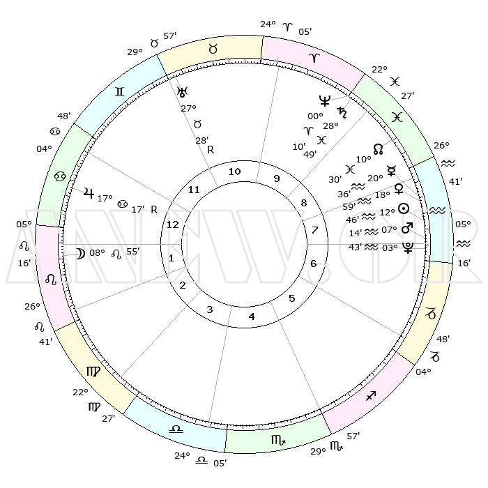 | | ΘΕΣΕΙΣ ΠΛΑΝΗΤΩΝ ΑΣΤΡΟΛΟΓΙΚΟΥ ΧΑΡΤΗ ΤΗΣ ΣΤΙΓΜΗΣ ΑΥΤΗΣ | | | | Πλανήτης | Ζώδιο | Μοίρες | Δεκαήμ. | Σε οίκο | Απόκλιση | | Ακμές των οίκων | | Ηλιος | Υδροχόος | 12°43' | Δεύτερο | 8 | 16 S 59 | | 1ος | 18°03' | Καρκίνος | | Σελήνη | Λέων | 08°05' | Πρώτο | 1 | 20 N 51 | | 2ος | 08°33' | Λέων | | Ερμής | Υδροχόος | 20°30' | Τρίτο | 8 | 16 S 24 | | 3ος | 02°03' | Παρθένος | | Αφροδίτη | Υδροχόος | 18°54' | Δεύτερο | 8 | 16 S 27 | | 4ος | 01°21' | Ζυγός | | Αρης | Υδροχόος | 07°11' | Πρώτο | 7 | 19 S 29 | | 5ος | 07°15' | Σκορπιός | | Δίας | Καρκίνος | 17°18'R | Δεύτερο | 12 | 22 N 37 | | 6ος | 14°58' | Τοξότης | | Κρόνος | Ιχθείς | 28°49' | Τρίτο | 9 | 02 S 28 | | 7ος | 18°03' | Αιγόκερως | | Ουρανός | Ταύρος | 27°28'R | Τρίτο | 11 | 19 N 24 | | 8ος | 08°33' | Υδροχόος | | Ποσειδώνας | Κριός | 00°10' | Πρώτο | 9 | 01 S 09 | | 9ος | 02°03' | Ιχθείς | | Πλούτωνας | Υδροχόος | 03°43' | Πρώτο | 7 | 23 S 01 | | 10ος | 01°21' | Κριός | | Β. Δεσμός | Ιχθείς | 10°30' | Δεύτερο | 9 | 07 S 38 | | 11ος | 07°15' | Ταύρος | | Ωροσκόπος | Καρκίνος | 18°03' | Δεύτερο | | | 12ος | 14°58' | Δίδυμοι | | Μεσουράνημα | Κριός | 01°21' | Πρώτο | | | |