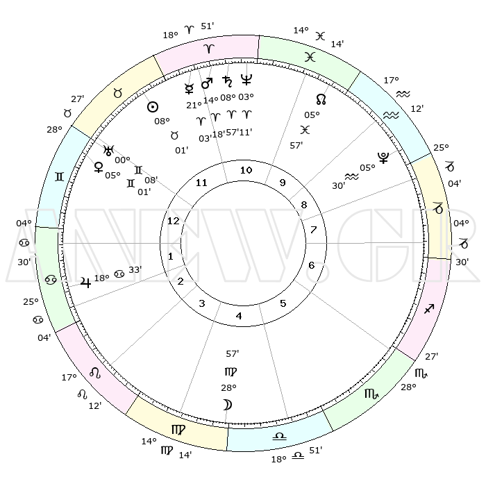 | | ΘΕΣΕΙΣ ΠΛΑΝΗΤΩΝ ΑΣΤΡΟΛΟΓΙΚΟΥ ΧΑΡΤΗ ΤΗΣ ΣΤΙΓΜΗΣ ΑΥΤΗΣ | | | | Πλανήτης | Ζώδιο | Μοίρες | Δεκαήμ. | Σε οίκο | Απόκλιση | | Ακμές των οίκων | | Ηλιος | Ταύρος | 07°58' | Πρώτο | 12 | 14 N 10 | | 1ος | 13°35' | Δίδυμοι | | Σελήνη | Παρθένος | 28°11' | Τρίτο | 5 | 00 S 56 | | 2ος | 06°02' | Καρκίνος | | Ερμής | Κριός | 20°56' | Τρίτο | 11 | 06 N 08 | | 3ος | 27°15' | Καρκίνος | | Αφροδίτη | Δίδυμοι | 04°57' | Πρώτο | 12 | 21 N 53 | | 4ος | 21°17' | Λέων | | Αρης | Κριός | 14°16' | Δεύτερο | 11 | 04 N 47 | | 5ος | 22°15' | Παρθένος | | Δίας | Καρκίνος | 18°32' | Δεύτερο | 2 | 22 N 32 | | 6ος | 02°17' | Σκορπιός | | Κρόνος | Κριός | 08°57' | Πρώτο | 11 | 01 N 33 | | 7ος | 13°35' | Τοξότης | | Ουρανός | Δίδυμοι | 00°08' | Πρώτο | 12 | 20 N 01 | | 8ος | 06°02' | Αιγόκερως | | Ποσειδώνας | Κριός | 03°11' | Πρώτο | 11 | 00 N 03 | | 9ος | 27°15' | Αιγόκερως | | Πλούτωνας | Υδροχόος | 05°30' | Πρώτο | 9 | 22 S 48 | | 10ος | 21°17' | Υδροχόος | | Β. Δεσμός | Ιχθείς | 05°58' | Πρώτο | 10 | 09 S 19 | | 11ος | 22°15' | Ιχθείς | | Ωροσκόπος | Δίδυμοι | 13°35' | Δεύτερο | | | 12ος | 02°16' | Ταύρος | | Μεσουράνημα | Υδροχόος | 21°17' | Τρίτο | | | |