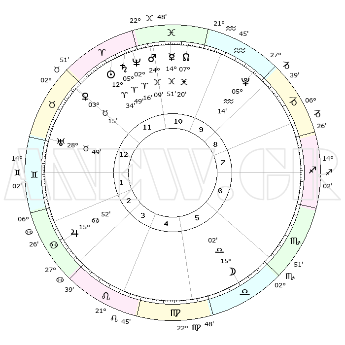 | | ΘΕΣΕΙΣ ΠΛΑΝΗΤΩΝ ΑΣΤΡΟΛΟΓΙΚΟΥ ΧΑΡΤΗ ΤΗΣ ΣΤΙΓΜΗΣ ΑΥΤΗΣ | | | | Πλανήτης | Ζώδιο | Μοίρες | Δεκαήμ. | Σε οίκο | Απόκλιση | | Ακμές των οίκων | | Ηλιος | Κριός | 12°30' | Δεύτερο | 12 | 04 N 56 | | 1ος | 15°24' | Ταύρος | | Σελήνη | Ζυγός | 14°12' | Δεύτερο | 6 | 08 S 23 | | 2ος | 13°32' | Δίδυμοι | | Ερμής | Ιχθείς | 14°47' | Δεύτερο | 11 | 07 S 22 | | 3ος | 05°45' | Καρκίνος | | Αφροδίτη | Ταύρος | 03°10' | Πρώτο | 12 | 12 N 12 | | 4ος | 27°43' | Καρκίνος | | Αρης | Ιχθείς | 24°06' | Τρίτο | 11 | 03 S 18 | | 5ος | 23°55' | Λέων | | Δίας | Καρκίνος | 15°52' | Δεύτερο | 3 | 22 N 52 | | 6ος | 29°43' | Παρθένος | | Κρόνος | Κριός | 05°49' | Πρώτο | 12 | 00 N 21 | | 7ος | 15°24' | Σκορπιός | | Ουρανός | Ταύρος | 28°49' | Τρίτο | 1 | 19 N 43 | | 8ος | 13°32' | Τοξότης | | Ποσειδώνας | Κριός | 02°15' | Πρώτο | 12 | 00 S 18 | | 9ος | 05°45' | Αιγόκερως | | Πλούτωνας | Υδροχόος | 05°14' | Πρώτο | 10 | 22 S 47 | | 10ος | 27°43' | Αιγόκερως | | Β. Δεσμός | Ιχθείς | 07°20' | Πρώτο | 11 | 08 S 49 | | 11ος | 23°55' | Υδροχόος | | Ωροσκόπος | Ταύρος | 15°24' | Δεύτερο | | | 12ος | 29°43' | Ιχθείς | | Μεσουράνημα | Αιγόκερως | 27°43' | Τρίτο | | | |