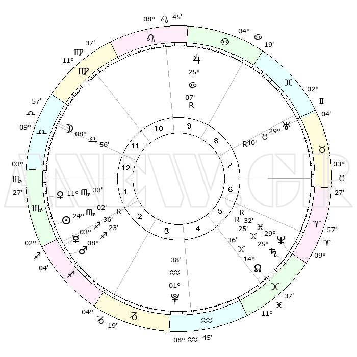 | | ΘΕΣΕΙΣ ΠΛΑΝΗΤΩΝ ΑΣΤΡΟΛΟΓΙΚΟΥ ΧΑΡΤΗ ΤΗΣ ΣΤΙΓΜΗΣ ΑΥΤΗΣ | | | | Πλανήτης | Ζώδιο | Μοίρες | Δεκαήμ. | Σε οίκο | Απόκλιση | | Ακμές των οίκων | | Ηλιος | Σκορπιός | 23°57' | Τρίτο | 2 | 18 S 45 | | 1ος | 13°58' | Ζυγός | | Σελήνη | Ζυγός | 08°08' | Πρώτο | 12 | 04 S 58 | | 2ος | 11°27' | Σκορπιός | | Ερμής | Τοξότης | 03°40'R | Πρώτο | 2 | 21 S 46 | | 3ος | 12°27' | Τοξότης | | Αφροδίτη | Σκορπιός | 11°28' | Δεύτερο | 2 | 14 S 09 | | 4ος | 15°46' | Αιγόκερως | | Αρης | Τοξότης | 08°20' | Πρώτο | 2 | 22 S 13 | | 5ος | 18°42' | Υδροχόος | | Δίας | Καρκίνος | 25°07'R | Τρίτο | 10 | 21 N 13 | | 6ος | 18°31' | Ιχθείς | | Κρόνος | Ιχθείς | 25°25'R | Τρίτο | 6 | 04 S 03 | | 7ος | 13°58' | Κριός | | Ουρανός | Ταύρος | 29°40'R | Τρίτο | 8 | 19 N 52 | | 8ος | 11°27' | Ταύρος | | Ποσειδώνας | Ιχθείς | 29°32'R | Τρίτο | 6 | 01 S 26 | | 9ος | 12°27' | Δίδυμοι | | Πλούτωνας | Υδροχόος | 01°38' | Πρώτο | 4 | 23 S 28 | | 10ος | 15°46' | Καρκίνος | | Β. Δεσμός | Ιχθείς | 14°36' | Δεύτερο | 5 | 06 S 04 | | 11ος | 18°42' | Λέων | | Ωροσκόπος | Ζυγός | 13°58' | Δεύτερο | | | 12ος | 18°31' | Παρθένος | | Μεσουράνημα | Καρκίνος | 15°46' | Δεύτερο | | | |