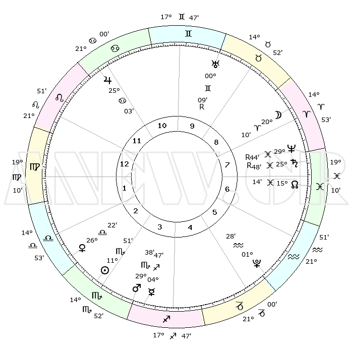 | | ΘΕΣΕΙΣ ΠΛΑΝΗΤΩΝ ΑΣΤΡΟΛΟΓΙΚΟΥ ΧΑΡΤΗ ΤΗΣ ΣΤΙΓΜΗΣ ΑΥΤΗΣ | | | | Πλανήτης | Ζώδιο | Μοίρες | Δεκαήμ. | Σε οίκο | Απόκλιση | | Ακμές των οίκων | | Ηλιος | Σκορπιός | 11°32' | Δεύτερο | 6 | 15 S 17 | | 1ος | 13°03' | Δίδυμοι | | Σελήνη | Κριός | 15°29' | Δεύτερο | 11 | 08 N 21 | | 2ος | 05°35' | Καρκίνος | | Ερμής | Τοξότης | 04°34' | Πρώτο | 6 | 23 S 52 | | 3ος | 26°48' | Καρκίνος | | Αφροδίτη | Ζυγός | 25°58' | Τρίτο | 5 | 08 S 41 | | 4ος | 20°47' | Λέων | | Αρης | Σκορπιός | 29°25' | Τρίτο | 6 | 20 S 26 | | 5ος | 21°38' | Παρθένος | | Δίας | Καρκίνος | 25°03' | Τρίτο | 2 | 21 N 12 | | 6ος | 01°38' | Σκορπιός | | Κρόνος | Ιχθείς | 25°48'R | Τρίτο | 11 | 03 S 55 | | 7ος | 13°03' | Τοξότης | | Ουρανός | Δίδυμοι | 00°10'R | Πρώτο | 12 | 19 N 59 | | 8ος | 05°35' | Αιγόκερως | | Ποσειδώνας | Ιχθείς | 29°44'R | Τρίτο | 11 | 01 S 22 | | 9ος | 26°48' | Αιγόκερως | | Πλούτωνας | Υδροχόος | 01°28' | Πρώτο | 9 | 23 S 30 | | 10ος | 20°47' | Υδροχόος | | Β. Δεσμός | Ιχθείς | 15°15' | Δεύτερο | 10 | 05 S 49 | | 11ος | 21°38' | Ιχθείς | | Ωροσκόπος | Δίδυμοι | 13°03' | Δεύτερο | | | 12ος | 01°38' | Ταύρος | | Μεσουράνημα | Υδροχόος | 20°47' | Τρίτο | | | |