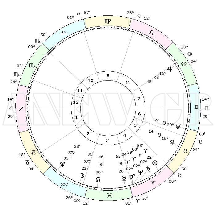 | | ΘΕΣΕΙΣ ΠΛΑΝΗΤΩΝ ΑΣΤΡΟΛΟΓΙΚΟΥ ΧΑΡΤΗ ΤΗΣ ΣΤΙΓΜΗΣ ΑΥΤΗΣ | | | | Πλανήτης | Ζώδιο | Μοίρες | Δεκαήμ. | Σε οίκο | Απόκλιση | | Ακμές των οίκων | | Ηλιος | Κριός | 22°54' | Τρίτο | 5 | 08 N 54 | | 1ος | 24°09' | Σκορπιός | | Σελήνη | Υδροχόος | 22°43' | Τρίτο | 3 | 15 S 14 | | 2ος | 24°32' | Τοξότης | | Ερμής | Ιχθείς | 26°49' | Τρίτο | 4 | 03 S 34 | | 3ος | 29°19' | Αιγόκερως | | Αφροδίτη | Ταύρος | 16°09' | Δεύτερο | 6 | 16 N 44 | | 4ος | 05°09' | Ιχθείς | | Αρης | Κριός | 02°20' | Πρώτο | 4 | 00 N 01 | | 5ος | 06°50' | Κριός | | Δίας | Καρκίνος | 16°45' | Δεύτερο | 8 | 22 N 46 | | 6ος | 02°41' | Ταύρος | | Κρόνος | Κριός | 07°07' | Πρώτο | 5 | 00 N 51 | | 7ος | 24°09' | Ταύρος | | Ουρανός | Ταύρος | 29°19' | Τρίτο | 7 | 19 N 50 | | 8ος | 24°32' | Δίδυμοι | | Ποσειδώνας | Κριός | 02°39' | Πρώτο | 4 | 00 S 09 | | 9ος | 29°19' | Καρκίνος | | Πλούτωνας | Υδροχόος | 05°23' | Πρώτο | 3 | 22 S 47 | | 10ος | 05°09' | Παρθένος | | Β. Δεσμός | Ιχθείς | 06°47' | Πρώτο | 4 | 09 S 01 | | 11ος | 06°50' | Ζυγός | | Ωροσκόπος | Σκορπιός | 24°09' | Τρίτο | | | 12ος | 02°41' | Σκορπιός | | Μεσουράνημα | Παρθένος | 05°09' | Πρώτο | | | |