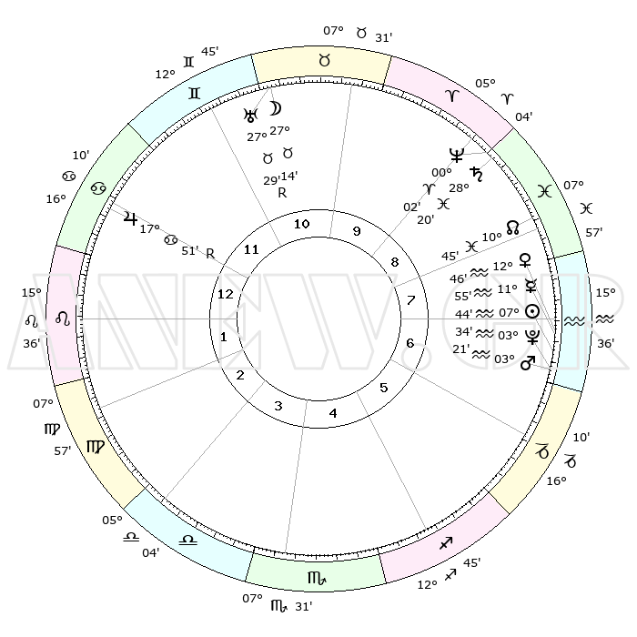 | | ΘΕΣΕΙΣ ΠΛΑΝΗΤΩΝ ΑΣΤΡΟΛΟΓΙΚΟΥ ΧΑΡΤΗ ΤΗΣ ΣΤΙΓΜΗΣ ΑΥΤΗΣ | | | | Πλανήτης | Ζώδιο | Μοίρες | Δεκαήμ. | Σε οίκο | Απόκλιση | | Ακμές των οίκων | | Ηλιος | Υδροχόος | 07°40' | Πρώτο | 7 | 18 S 21 | | 1ος | 25°47' | Καρκίνος | | Σελήνη | Ταύρος | 26°16' | Τρίτο | 11 | 24 N 14 | | 2ος | 16°34' | Λέων | | Ερμής | Υδροχόος | 11°48' | Δεύτερο | 7 | 19 S 13 | | 3ος | 11°03' | Παρθένος | | Αφροδίτη | Υδροχόος | 12°41' | Δεύτερο | 7 | 18 S 14 | | 4ος | 11°32' | Ζυγός | | Αρης | Υδροχόος | 03°18' | Πρώτο | 7 | 20 S 25 | | 5ος | 17°38' | Σκορπιός | | Δίας | Καρκίνος | 17°52'R | Δεύτερο | 12 | 22 N 32 | | 6ος | 24°02' | Τοξότης | | Κρόνος | Ιχθείς | 28°20' | Τρίτο | 9 | 02 S 40 | | 7ος | 25°47' | Αιγόκερως | | Ουρανός | Ταύρος | 27°29'R | Τρίτο | 11 | 19 N 24 | | 8ος | 16°34' | Υδροχόος | | Ποσειδώνας | Κριός | 00°02' | Πρώτο | 9 | 01 S 12 | | 9ος | 11°03' | Ιχθείς | | Πλούτωνας | Υδροχόος | 03°34' | Πρώτο | 7 | 23 S 03 | | 10ος | 11°32' | Κριός | | Β. Δεσμός | Ιχθείς | 10°46' | Δεύτερο | 8 | 07 S 32 | | 11ος | 17°38' | Ταύρος | | Ωροσκόπος | Καρκίνος | 25°47' | Τρίτο | | | 12ος | 24°02' | Δίδυμοι | | Μεσουράνημα | Κριός | 11°32' | Δεύτερο | | | |