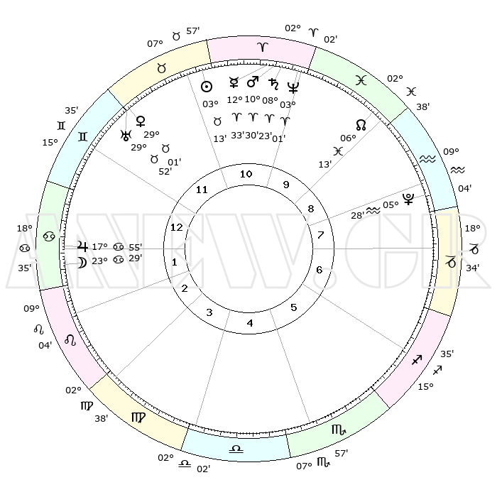 | | ΘΕΣΕΙΣ ΠΛΑΝΗΤΩΝ ΑΣΤΡΟΛΟΓΙΚΟΥ ΧΑΡΤΗ ΤΗΣ ΣΤΙΓΜΗΣ ΑΥΤΗΣ | | | | Πλανήτης | Ζώδιο | Μοίρες | Δεκαήμ. | Σε οίκο | Απόκλιση | | Ακμές των οίκων | | Ηλιος | Ταύρος | 02°21' | Πρώτο | 9 | 12 N 17 | | 1ος | 22°52' | Λέων | | Σελήνη | Καρκίνος | 11°01' | Δεύτερο | 11 | 27 N 13 | | 2ος | 15°59' | Παρθένος | | Ερμής | Κριός | 11°07' | Δεύτερο | 8 | 02 N 03 | | 3ος | 13°56' | Ζυγός | | Αφροδίτη | Ταύρος | 27°57' | Τρίτο | 10 | 20 N 12 | | 4ος | 16°43' | Σκορπιός | | Αρης | Κριός | 09°50' | Πρώτο | 8 | 03 N 01 | | 5ος | 21°25' | Τοξότης | | Δίας | Καρκίνος | 17°48' | Δεύτερο | 11 | 22 N 38 | | 6ος | 24°00' | Αιγόκερως | | Κρόνος | Κριός | 08°17' | Πρώτο | 8 | 01 N 18 | | 7ος | 22°52' | Υδροχόος | | Ουρανός | Ταύρος | 29°49' | Τρίτο | 10 | 19 N 57 | | 8ος | 15°59' | Ιχθείς | | Ποσειδώνας | Κριός | 02°59' | Πρώτο | 8 | 00 S 01 | | 9ος | 13°56' | Κριός | | Πλούτωνας | Υδροχόος | 05°28' | Πρώτο | 6 | 22 S 48 | | 10ος | 16°43' | Ταύρος | | Β. Δεσμός | Ιχθείς | 06°16' | Πρώτο | 7 | 09 S 13 | | 11ος | 21°25' | Δίδυμοι | | Ωροσκόπος | Λέων | 22°52' | Τρίτο | | | 12ος | 24°00' | Καρκίνος | | Μεσουράνημα | Ταύρος | 16°43' | Δεύτερο | | | |