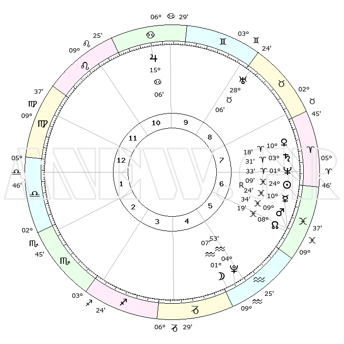 | | ΘΕΣΕΙΣ ΠΛΑΝΗΤΩΝ ΑΣΤΡΟΛΟΓΙΚΟΥ ΧΑΡΤΗ ΤΗΣ ΣΤΙΓΜΗΣ ΑΥΤΗΣ | | | | Πλανήτης | Ζώδιο | Μοίρες | Δεκαήμ. | Σε οίκο | Απόκλιση | | Ακμές των οίκων | | Ηλιος | Ιχθείς | 24°05' | Τρίτο | 7 | 02 S 21 | | 1ος | 17°57' | Παρθένος | | Σελήνη | Υδροχόος | 00°22' | Πρώτο | 5 | 23 S 17 | | 2ος | 13°34' | Ζυγός | | Ερμής | Ιχθείς | 10°27'R | Δεύτερο | 6 | 05 S 20 | | 3ος | 13°29' | Σκορπιός | | Αφροδίτη | Κριός | 10°13' | Δεύτερο | 7 | 03 N 04 | | 4ος | 16°25' | Τοξότης | | Αρης | Ιχθείς | 09°31' | Πρώτο | 6 | 09 S 00 | | 5ος | 19°40' | Αιγόκερως | | Δίας | Καρκίνος | 15°06' | Δεύτερο | 10 | 22 N 56 | | 6ος | 20°34' | Υδροχόος | | Κρόνος | Κριός | 03°30' | Πρώτο | 7 | 00 S 33 | | 7ος | 17°57' | Ιχθείς | | Ουρανός | Ταύρος | 28°06' | Τρίτο | 9 | 19 N 34 | | 8ος | 13°34' | Κριός | | Ποσειδώνας | Κριός | 01°33' | Πρώτο | 7 | 00 S 35 | | 9ος | 13°29' | Ταύρος | | Πλούτωνας | Υδροχόος | 04°53' | Πρώτο | 5 | 22 S 50 | | 10ος | 16°25' | Δίδυμοι | | Β. Δεσμός | Ιχθείς | 08°19' | Πρώτο | 6 | 08 S 27 | | 11ος | 19°40' | Καρκίνος | | Ωροσκόπος | Παρθένος | 17°57' | Δεύτερο | | | 12ος | 20°34' | Λέων | | Μεσουράνημα | Δίδυμοι | 16°25' | Δεύτερο | | | |