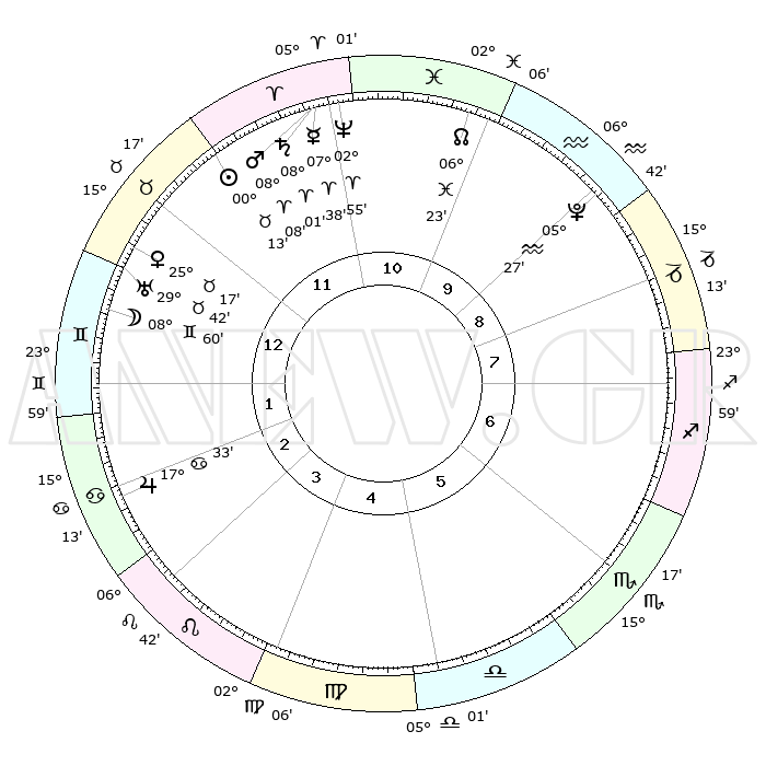| | ΘΕΣΕΙΣ ΠΛΑΝΗΤΩΝ ΑΣΤΡΟΛΟΓΙΚΟΥ ΧΑΡΤΗ ΤΗΣ ΣΤΙΓΜΗΣ ΑΥΤΗΣ | | | | Πλανήτης | Ζώδιο | Μοίρες | Δεκαήμ. | Σε οίκο | Απόκλιση | | Ακμές των οίκων | | Ηλιος | Ταύρος | 00°09' | Πρώτο | 12 | 11 N 31 | | 1ος | 29°50' | Ταύρος | | Σελήνη | Δίδυμοι | 08°04' | Πρώτο | 1 | 26 N 41 | | 2ος | 24°40' | Δίδυμοι | | Ερμής | Κριός | 07°33' | Πρώτο | 11 | 00 N 35 | | 3ος | 16°06' | Καρκίνος | | Αφροδίτη | Ταύρος | 25°12' | Τρίτο | 12 | 19 N 28 | | 4ος | 08°51' | Λέων | | Αρης | Κριός | 08°05' | Πρώτο | 11 | 02 N 20 | | 5ος | 07°17' | Παρθένος | | Δίας | Καρκίνος | 17°32' | Δεύτερο | 3 | 22 N 40 | | 6ος | 15°42' | Ζυγός | | Κρόνος | Κριός | 08°01' | Πρώτο | 11 | 01 N 12 | | 7ος | 29°50' | Σκορπιός | | Ουρανός | Ταύρος | 29°42' | Τρίτο | 12 | 19 N 55 | | 8ος | 24°40' | Τοξότης | | Ποσειδώνας | Κριός | 02°54' | Πρώτο | 11 | 00 S 03 | | 9ος | 16°06' | Αιγόκερως | | Πλούτωνας | Υδροχόος | 05°27' | Πρώτο | 9 | 22 S 48 | | 10ος | 08°51' | Υδροχόος | | Β. Δεσμός | Ιχθείς | 06°23' | Πρώτο | 10 | 09 S 10 | | 11ος | 07°17' | Ιχθείς | | Ωροσκόπος | Ταύρος | 29°50' | Τρίτο | | | 12ος | 15°42' | Κριός | | Μεσουράνημα | Υδροχόος | 08°51' | Πρώτο | | | |