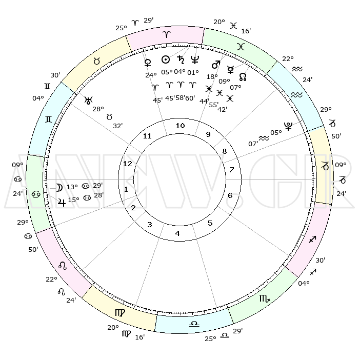 | | ΘΕΣΕΙΣ ΠΛΑΝΗΤΩΝ ΑΣΤΡΟΛΟΓΙΚΟΥ ΧΑΡΤΗ ΤΗΣ ΣΤΙΓΜΗΣ ΑΥΤΗΣ | | | | Πλανήτης | Ζώδιο | Μοίρες | Δεκαήμ. | Σε οίκο | Απόκλιση | | Ακμές των οίκων | | Ηλιος | Κριός | 05°40' | Πρώτο | 11 | 02 N 15 | | 1ος | 14°10' | Δίδυμοι | | Σελήνη | Καρκίνος | 12°27' | Δεύτερο | 2 | 27 N 11 | | 2ος | 06°32' | Καρκίνος | | Ερμής | Ιχθείς | 09°53' | Πρώτο | 10 | 08 S 07 | | 3ος | 27°46' | Καρκίνος | | Αφροδίτη | Κριός | 24°39' | Τρίτο | 11 | 08 N 56 | | 4ος | 21°52' | Λέων | | Αρης | Ιχθείς | 18°41' | Δεύτερο | 10 | 05 S 27 | | 5ος | 22°56' | Παρθένος | | Δίας | Καρκίνος | 15°27' | Δεύτερο | 2 | 22 N 54 | | 6ος | 03°00' | Σκορπιός | | Κρόνος | Κριός | 04°57' | Πρώτο | 11 | 00 N 01 | | 7ος | 14°10' | Τοξότης | | Ουρανός | Ταύρος | 28°32' | Τρίτο | 12 | 19 N 39 | | 8ος | 06°32' | Αιγόκερως | | Ποσειδώνας | Κριός | 01°60' | Πρώτο | 11 | 00 S 24 | | 9ος | 27°46' | Αιγόκερως | | Πλούτωνας | Υδροχόος | 05°07' | Πρώτο | 9 | 22 S 48 | | 10ος | 21°52' | Υδροχόος | | Β. Δεσμός | Ιχθείς | 07°42' | Πρώτο | 10 | 08 S 41 | | 11ος | 22°56' | Ιχθείς | | Ωροσκόπος | Δίδυμοι | 14°10' | Δεύτερο | | | 12ος | 03°00' | Ταύρος | | Μεσουράνημα | Υδροχόος | 21°52' | Τρίτο | | | |