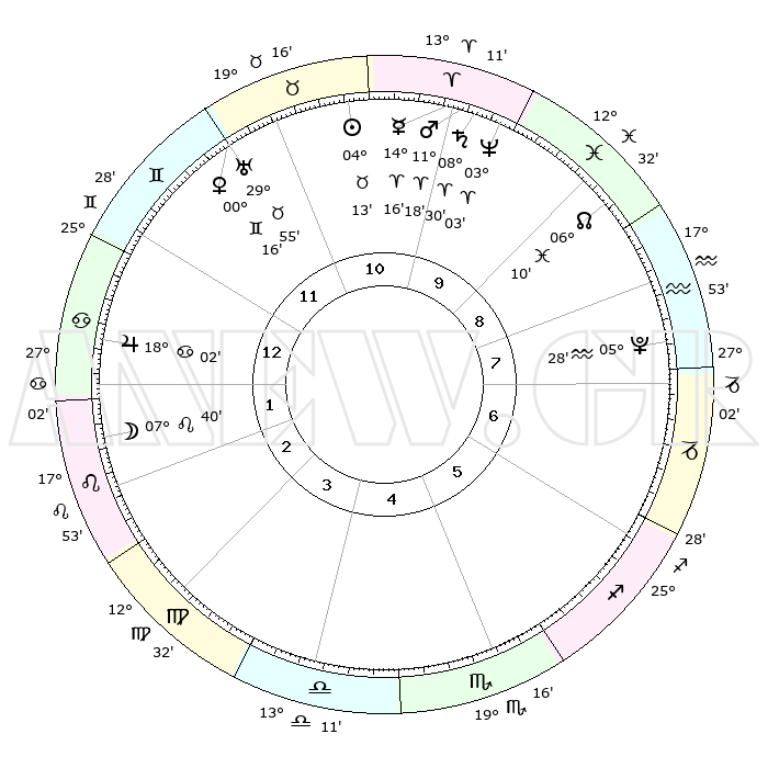 | | ΘΕΣΕΙΣ ΠΛΑΝΗΤΩΝ ΑΣΤΡΟΛΟΓΙΚΟΥ ΧΑΡΤΗ ΤΗΣ ΣΤΙΓΜΗΣ ΑΥΤΗΣ | | | | Πλανήτης | Ζώδιο | Μοίρες | Δεκαήμ. | Σε οίκο | Απόκλιση | | Ακμές των οίκων | | Ηλιος | Ταύρος | 03°48' | Πρώτο | 3 | 12 N 47 | | 1ος | 20°00' | Αιγόκερως | | Σελήνη | Λέων | 01°52' | Πρώτο | 7 | 22 N 38 | | 2ος | 02°08' | Ιχθείς | | Ερμής | Κριός | 13°33' | Δεύτερο | 3 | 03 N 03 | | 3ος | 11°52' | Κριός | | Αφροδίτη | Ταύρος | 29°45' | Τρίτο | 4 | 20 N 40 | | 4ος | 12°09' | Ταύρος | | Αρης | Κριός | 10°58' | Δεύτερο | 2 | 03 N 29 | | 5ος | 05°48' | Δίδυμοι | | Δίας | Καρκίνος | 17°59' | Δεύτερο | 6 | 22 N 36 | | 6ος | 27°00' | Δίδυμοι | | Κρόνος | Κριός | 08°27' | Πρώτο | 2 | 01 N 22 | | 7ος | 20°00' | Καρκίνος | | Ουρανός | Ταύρος | 29°54' | Τρίτο | 4 | 19 N 58 | | 8ος | 02°08' | Παρθένος | | Ποσειδώνας | Κριός | 03°02' | Πρώτο | 2 | 00 S 00 | | 9ος | 11°52' | Ζυγός | | Πλούτωνας | Υδροχόος | 05°28' | Πρώτο | 1 | 22 S 48 | | 10ος | 12°09' | Σκορπιός | | Β. Δεσμός | Ιχθείς | 06°11' | Πρώτο | 2 | 09 S 14 | | 11ος | 05°48' | Τοξότης | | Ωροσκόπος | Αιγόκερως | 20°00' | Τρίτο | | | 12ος | 27°00' | Τοξότης | | Μεσουράνημα | Σκορπιός | 12°09' | Δεύτερο | | | |