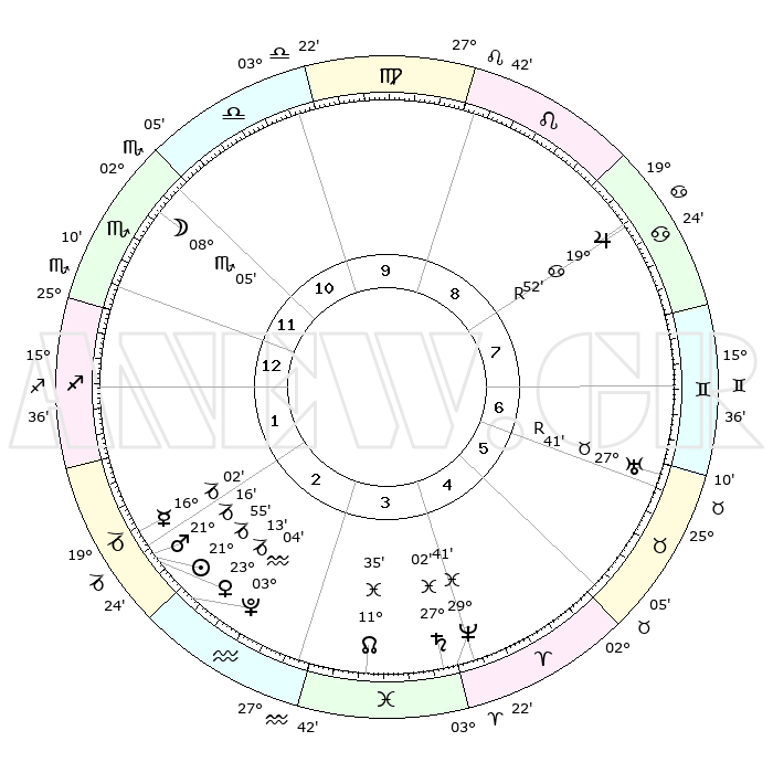 | | ΘΕΣΕΙΣ ΠΛΑΝΗΤΩΝ ΑΣΤΡΟΛΟΓΙΚΟΥ ΧΑΡΤΗ ΤΗΣ ΣΤΙΓΜΗΣ ΑΥΤΗΣ | | | | Πλανήτης | Ζώδιο | Μοίρες | Δεκαήμ. | Σε οίκο | Απόκλιση | | Ακμές των οίκων | | Ηλιος | Αιγόκερως | 21°51' | Τρίτο | 2 | 21 S 40 | | 1ος | 25°24' | Σκορπιός | | Σελήνη | Σκορπιός | 07°16' | Πρώτο | 12 | 18 S 00 | | 2ος | 25°56' | Τοξότης | | Ερμής | Αιγόκερως | 15°55' | Δεύτερο | 2 | 24 S 04 | | 3ος | 00°54' | Υδροχόος | | Αφροδίτη | Αιγόκερως | 23°08' | Τρίτο | 2 | 22 S 20 | | 4ος | 06°48' | Ιχθείς | | Αρης | Αιγόκερως | 21°13' | Τρίτο | 2 | 22 S 42 | | 5ος | 08°21' | Κριός | | Δίας | Καρκίνος | 19°52'R | Δεύτερο | 8 | 22 N 13 | | 6ος | 04°02' | Ταύρος | | Κρόνος | Ιχθείς | 27°01' | Τρίτο | 4 | 03 S 14 | | 7ος | 25°24' | Ταύρος | | Ουρανός | Ταύρος | 27°41'R | Τρίτο | 7 | 19 N 27 | | 8ος | 25°56' | Δίδυμοι | | Ποσειδώνας | Ιχθείς | 29°41' | Τρίτο | 4 | 01 S 21 | | 9ος | 00°54' | Λέων | | Πλούτωνας | Υδροχόος | 03°04' | Πρώτο | 3 | 23 S 09 | | 10ος | 06°48' | Παρθένος | | Β. Δεσμός | Ιχθείς | 11°35' | Δεύτερο | 4 | 07 S 13 | | 11ος | 08°21' | Ζυγός | | Ωροσκόπος | Σκορπιός | 25°24' | Τρίτο | | | 12ος | 04°02' | Σκορπιός | | Μεσουράνημα | Παρθένος | 06°48' | Πρώτο | | | |