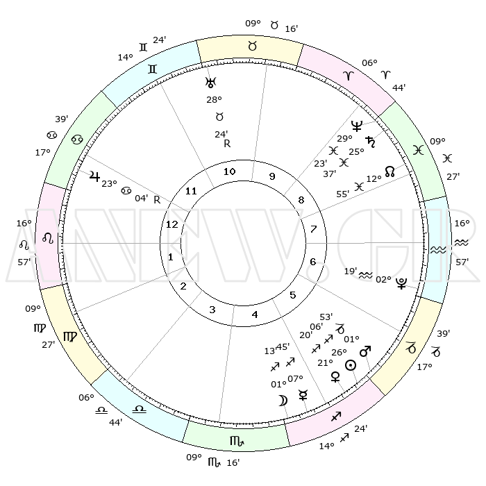 | | ΘΕΣΕΙΣ ΠΛΑΝΗΤΩΝ ΑΣΤΡΟΛΟΓΙΚΟΥ ΧΑΡΤΗ ΤΗΣ ΣΤΙΓΜΗΣ ΑΥΤΗΣ | | | | Πλανήτης | Ζώδιο | Μοίρες | Δεκαήμ. | Σε οίκο | Απόκλιση | | Ακμές των οίκων | | Ηλιος | Τοξότης | 26°01' | Τρίτο | 6 | 23 S 22 | | 1ος | 24°55' | Καρκίνος | | Σελήνη | Τοξότης | 00°19' | Πρώτο | 5 | 24 S 59 | | 2ος | 15°40' | Λέων | | Ερμής | Τοξότης | 07°39' | Πρώτο | 5 | 20 S 24 | | 3ος | 10°02' | Παρθένος | | Αφροδίτη | Τοξότης | 21°15' | Τρίτο | 5 | 23 S 05 | | 4ος | 10°23' | Ζυγός | | Αρης | Αιγόκερως | 01°50' | Πρώτο | 6 | 24 S 13 | | 5ος | 16°29' | Σκορπιός | | Δίας | Καρκίνος | 23°05'R | Τρίτο | 12 | 21 N 40 | | 6ος | 23°02' | Τοξότης | | Κρόνος | Ιχθείς | 25°37' | Τρίτο | 9 | 03 S 52 | | 7ος | 24°55' | Αιγόκερως | | Ουρανός | Ταύρος | 28°24'R | Τρίτο | 11 | 19 N 36 | | 8ος | 15°40' | Υδροχόος | | Ποσειδώνας | Ιχθείς | 29°23' | Τρίτο | 9 | 01 S 29 | | 9ος | 10°02' | Ιχθείς | | Πλούτωνας | Υδροχόος | 02°19' | Πρώτο | 7 | 23 S 18 | | 10ος | 10°23' | Κριός | | Β. Δεσμός | Ιχθείς | 12°56' | Δεύτερο | 9 | 06 S 42 | | 11ος | 16°29' | Ταύρος | | Ωροσκόπος | Καρκίνος | 24°55' | Τρίτο | | | 12ος | 23°02' | Δίδυμοι | | Μεσουράνημα | Κριός | 10°23' | Δεύτερο | | | |