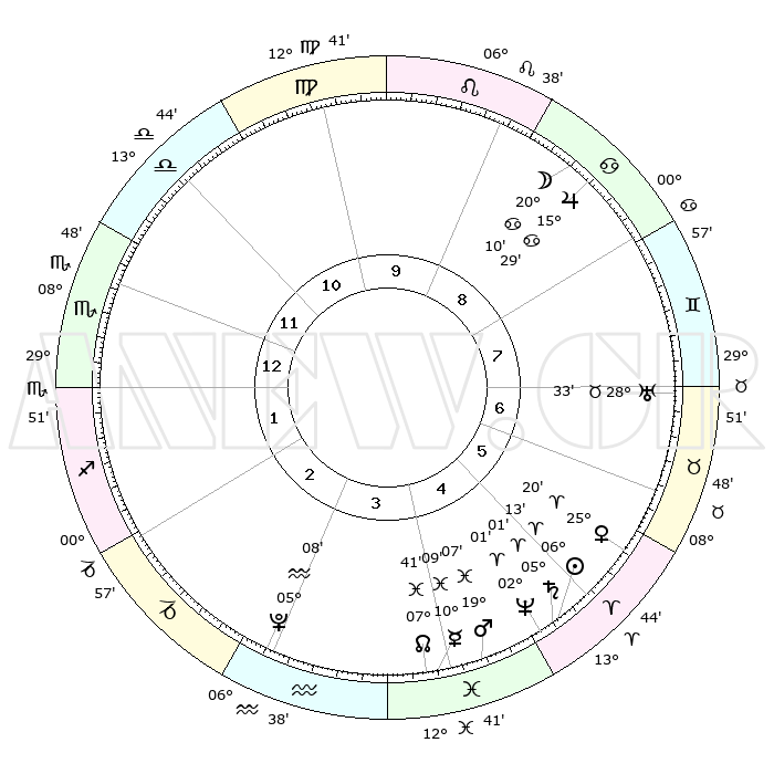 | | ΘΕΣΕΙΣ ΠΛΑΝΗΤΩΝ ΑΣΤΡΟΛΟΓΙΚΟΥ ΧΑΡΤΗ ΤΗΣ ΣΤΙΓΜΗΣ ΑΥΤΗΣ | | | | Πλανήτης | Ζώδιο | Μοίρες | Δεκαήμ. | Σε οίκο | Απόκλιση | | Ακμές των οίκων | | Ηλιος | Κριός | 06°09' | Πρώτο | 5 | 02 N 27 | | 1ος | 11°19' | Σκορπιός | | Σελήνη | Καρκίνος | 19°17' | Δεύτερο | 9 | 25 N 59 | | 2ος | 10°29' | Τοξότης | | Ερμής | Ιχθείς | 10°07' | Δεύτερο | 4 | 08 S 07 | | 3ος | 13°32' | Αιγόκερως | | Αφροδίτη | Κριός | 25°15' | Τρίτο | 6 | 09 N 10 | | 4ος | 18°32' | Υδροχόος | | Αρης | Ιχθείς | 19°04' | Δεύτερο | 4 | 05 S 18 | | 5ος | 21°09' | Ιχθείς | | Δίας | Καρκίνος | 15°29' | Δεύτερο | 9 | 22 N 54 | | 6ος | 18°38' | Κριός | | Κρόνος | Κριός | 05°01' | Πρώτο | 5 | 00 N 02 | | 7ος | 11°19' | Ταύρος | | Ουρανός | Ταύρος | 28°33' | Τρίτο | 7 | 19 N 40 | | 8ος | 10°29' | Δίδυμοι | | Ποσειδώνας | Κριός | 02°01' | Πρώτο | 5 | 00 S 24 | | 9ος | 13°32' | Καρκίνος | | Πλούτωνας | Υδροχόος | 05°08' | Πρώτο | 3 | 22 S 48 | | 10ος | 18°32' | Λέων | | Β. Δεσμός | Ιχθείς | 07°41' | Πρώτο | 4 | 08 S 41 | | 11ος | 21°09' | Παρθένος | | Ωροσκόπος | Σκορπιός | 11°19' | Δεύτερο | | | 12ος | 18°38' | Ζυγός | | Μεσουράνημα | Λέων | 18°32' | Δεύτερο | | | |