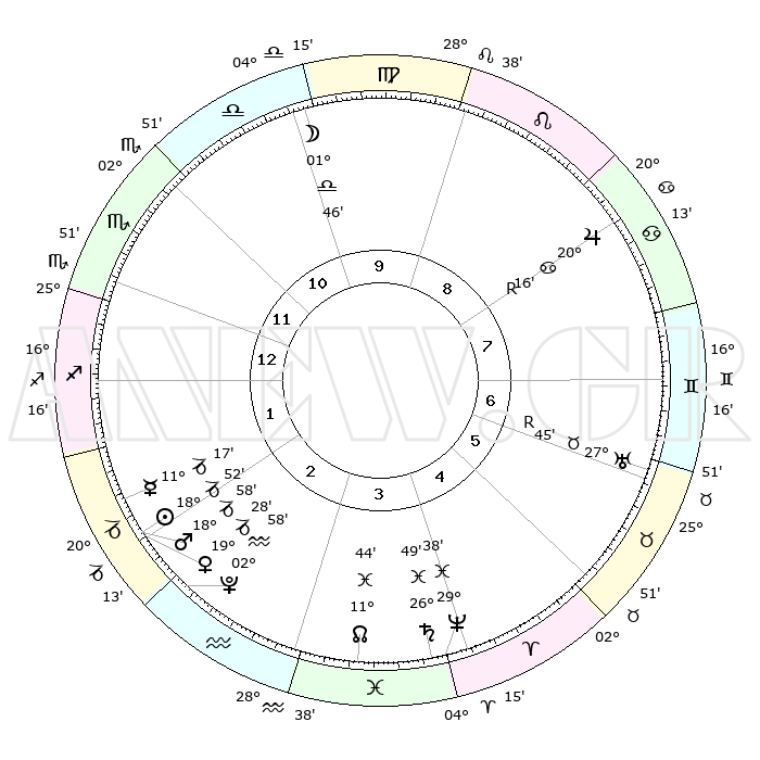 | | ΘΕΣΕΙΣ ΠΛΑΝΗΤΩΝ ΑΣΤΡΟΛΟΓΙΚΟΥ ΧΑΡΤΗ ΤΗΣ ΣΤΙΓΜΗΣ ΑΥΤΗΣ | | | | Πλανήτης | Ζώδιο | Μοίρες | Δεκαήμ. | Σε οίκο | Απόκλιση | | Ακμές των οίκων | | Ηλιος | Αιγόκερως | 17°53' | Δεύτερο | 1 | 22 S 14 | | 1ος | 26°34' | Τοξότης | | Σελήνη | Παρθένος | 19°30' | Δεύτερο | 9 | 03 N 24 | | 2ος | 02°51' | Υδροχόος | | Ερμής | Αιγόκερως | 09°46' | Πρώτο | 1 | 24 S 21 | | 3ος | 12°34' | Ιχθείς | | Αφροδίτη | Αιγόκερως | 18°15' | Δεύτερο | 1 | 22 S 57 | | 4ος | 17°02' | Κριός | | Αρης | Αιγόκερως | 18°13' | Δεύτερο | 1 | 23 S 07 | | 5ος | 13°54' | Ταύρος | | Δίας | Καρκίνος | 20°24'R | Τρίτο | 7 | 22 N 08 | | 6ος | 05°57' | Δίδυμοι | | Κρόνος | Ιχθείς | 26°45' | Τρίτο | 3 | 03 S 21 | | 7ος | 26°34' | Δίδυμοι | | Ουρανός | Ταύρος | 27°46'R | Τρίτο | 5 | 19 N 28 | | 8ος | 02°51' | Λέων | | Ποσειδώνας | Ιχθείς | 29°37' | Τρίτο | 3 | 01 S 22 | | 9ος | 12°34' | Παρθένος | | Πλούτωνας | Υδροχόος | 02°57' | Πρώτο | 2 | 23 S 10 | | 10ος | 17°02' | Ζυγός | | Β. Δεσμός | Ιχθείς | 11°47' | Δεύτερο | 2 | 07 S 08 | | 11ος | 13°54' | Σκορπιός | | Ωροσκόπος | Τοξότης | 26°34' | Τρίτο | | | 12ος | 05°57' | Τοξότης | | Μεσουράνημα | Ζυγός | 17°02' | Δεύτερο | | | |