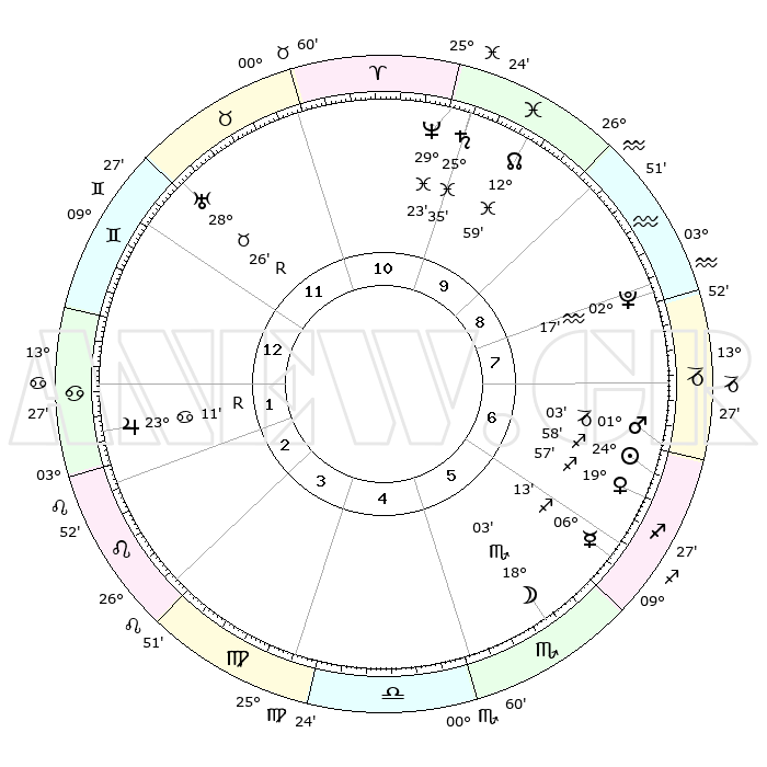 | | ΘΕΣΕΙΣ ΠΛΑΝΗΤΩΝ ΑΣΤΡΟΛΟΓΙΚΟΥ ΧΑΡΤΗ ΤΗΣ ΣΤΙΓΜΗΣ ΑΥΤΗΣ | | | | Πλανήτης | Ζώδιο | Μοίρες | Δεκαήμ. | Σε οίκο | Απόκλιση | | Ακμές των οίκων | | Ηλιος | Τοξότης | 24°38' | Τρίτο | 11 | 23 S 19 | | 1ος | 12°37' | Υδροχόος | | Σελήνη | Σκορπιός | 14°13' | Δεύτερο | 9 | 20 S 18 | | 2ος | 28°11' | Ιχθείς | | Ερμής | Τοξότης | 05°46' | Πρώτο | 10 | 19 S 55 | | 3ος | 04°22' | Ταύρος | | Αφροδίτη | Τοξότης | 19°32' | Δεύτερο | 10 | 22 S 55 | | 4ος | 00°51' | Δίδυμοι | | Αρης | Αιγόκερως | 00°48' | Πρώτο | 11 | 24 S 13 | | 5ος | 22°54' | Δίδυμοι | | Δίας | Καρκίνος | 23°13'R | Τρίτο | 6 | 21 N 38 | | 6ος | 14°59' | Καρκίνος | | Κρόνος | Ιχθείς | 25°34' | Τρίτο | 1 | 03 S 53 | | 7ος | 12°37' | Λέων | | Ουρανός | Ταύρος | 28°27'R | Τρίτο | 3 | 19 N 37 | | 8ος | 28°11' | Παρθένος | | Ποσειδώνας | Ιχθείς | 29°23' | Τρίτο | 2 | 01 S 29 | | 9ος | 04°22' | Σκορπιός | | Πλούτωνας | Υδροχόος | 02°17' | Πρώτο | 12 | 23 S 19 | | 10ος | 00°51' | Τοξότης | | Β. Δεσμός | Ιχθείς | 12°60' | Δεύτερο | 1 | 06 S 41 | | 11ος | 22°54' | Τοξότης | | Ωροσκόπος | Υδροχόος | 12°37' | Δεύτερο | | | 12ος | 14°59' | Αιγόκερως | | Μεσουράνημα | Τοξότης | 00°51' | Πρώτο | | | |