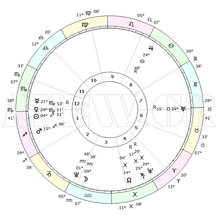 | | ΘΕΣΕΙΣ ΠΛΑΝΗΤΩΝ ΑΣΤΡΟΛΟΓΙΚΟΥ ΧΑΡΤΗ ΤΗΣ ΣΤΙΓΜΗΣ ΑΥΤΗΣ | | | | Πλανήτης | Ζώδιο | Μοίρες | Δεκαήμ. | Σε οίκο | Απόκλιση | | Ακμές των οίκων | | Ηλιος | Τοξότης | 04°11' | Πρώτο | 1 | 20 S 59 | | 1ος | 26°27' | Σκορπιός | | Σελήνη | Υδροχόος | 09°32' | Πρώτο | 3 | 20 S 38 | | 2ος | 27°07' | Τοξότης | | Ερμής | Σκορπιός | 21°53'R | Τρίτο | 12 | 16 S 11 | | 3ος | 02°15' | Υδροχόος | | Αφροδίτη | Σκορπιός | 24°10' | Τρίτο | 12 | 17 S 58 | | 4ος | 08°11' | Ιχθείς | | Αρης | Τοξότης | 15°45' | Δεύτερο | 1 | 23 S 17 | | 5ος | 09°38' | Κριός | | Δίας | Καρκίνος | 24°48'R | Τρίτο | 8 | 21 N 18 | | 6ος | 05°10' | Ταύρος | | Κρόνος | Ιχθείς | 25°17'R | Τρίτο | 4 | 04 S 04 | | 7ος | 26°27' | Ταύρος | | Ουρανός | Ταύρος | 29°15'R | Τρίτο | 7 | 19 N 47 | | 8ος | 27°07' | Δίδυμοι | | Ποσειδώνας | Ιχθείς | 29°26'R | Τρίτο | 4 | 01 S 28 | | 9ος | 02°15' | Λέων | | Πλούτωνας | Υδροχόος | 01°48' | Πρώτο | 2 | 23 S 25 | | 10ος | 08°11' | Παρθένος | | Β. Δεσμός | Ιχθείς | 14°04' | Δεύτερο | 4 | 06 S 16 | | 11ος | 09°38' | Ζυγός | | Ωροσκόπος | Σκορπιός | 26°27' | Τρίτο | | | 12ος | 05°10' | Σκορπιός | | Μεσουράνημα | Παρθένος | 08°11' | Πρώτο | | | |
